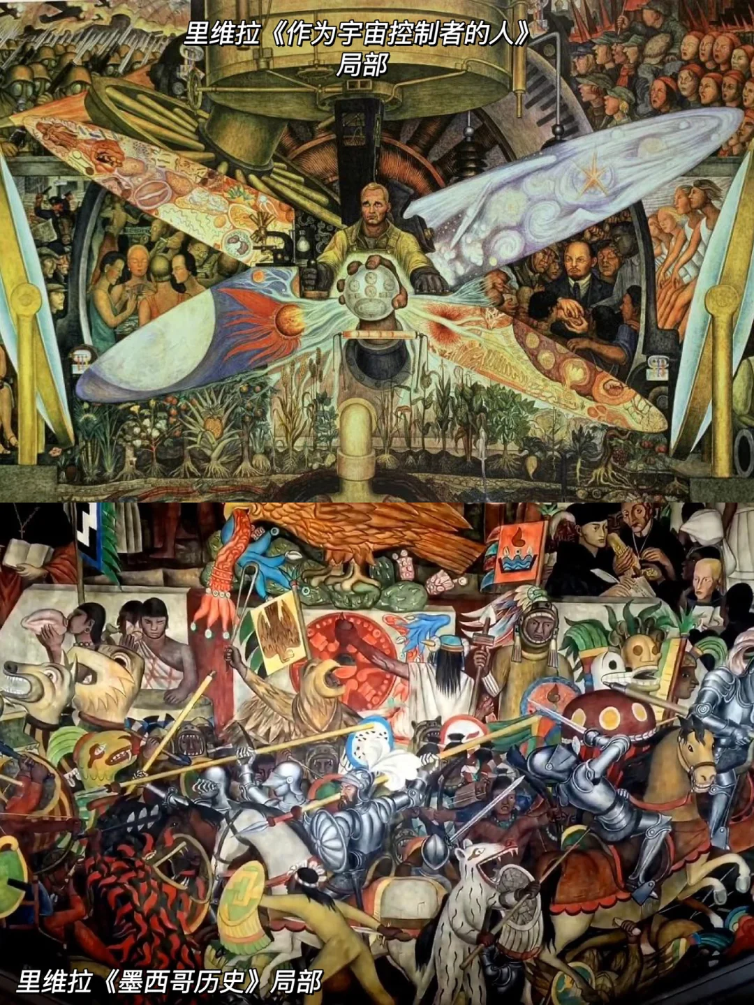 -奥罗斯科是最年长的一位,他从表现主义中获取灵感,直白地描绘出苦难;西盖罗斯是最激进的一位,他采用先进技术、材料,并融合科技与机械元素;里维拉则是最知名的一位,他将前卫艺术与墨西哥传统绘画相结合,创作出色彩缤纷的历史长卷。
