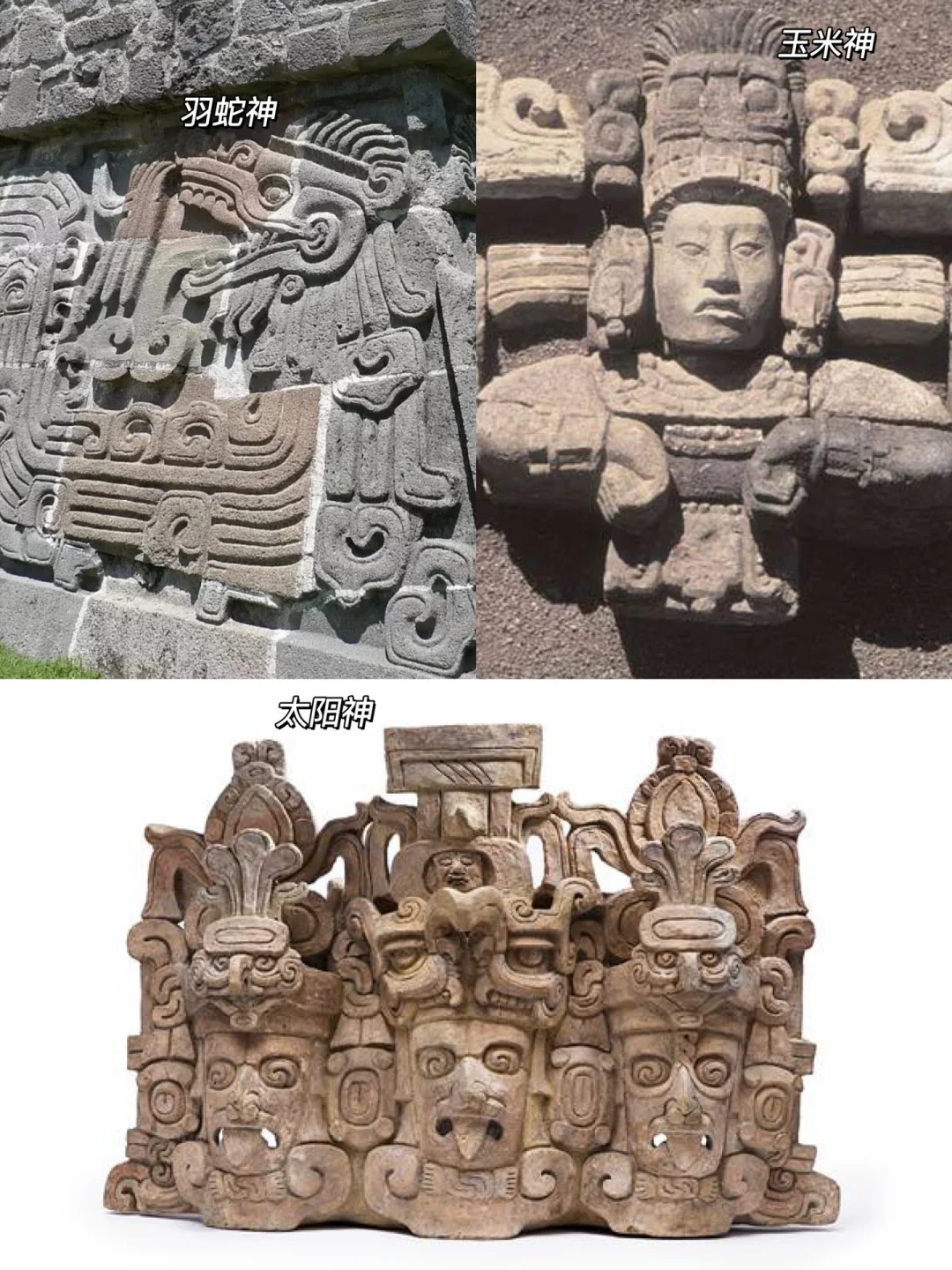-神明有太阳神、五谷神、玉米神、羽蛇神等等,在金字塔墙壁上能看到关于它们的石刻。其中羽蛇神代表着植物之神、重生之神、祭祀保护神和艺术之神,是最出名的。