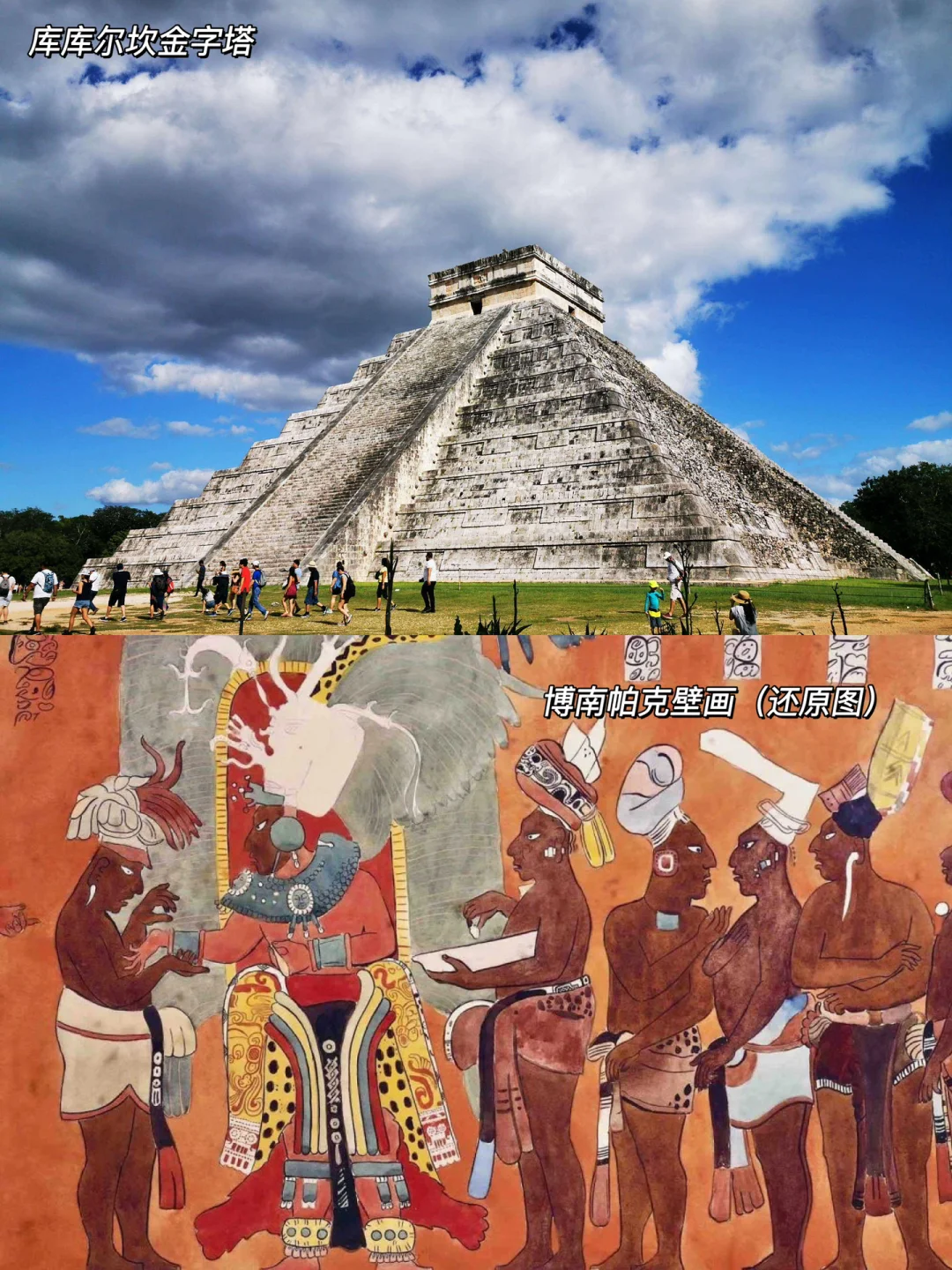 -在博南帕克神庙中,玛雅壁画也被完整保存下来,主要原因是玛雅人画干壁画,不像湿壁画那么容易脱落,画中描绘了国王昌恩.穆安二世统治的故事。