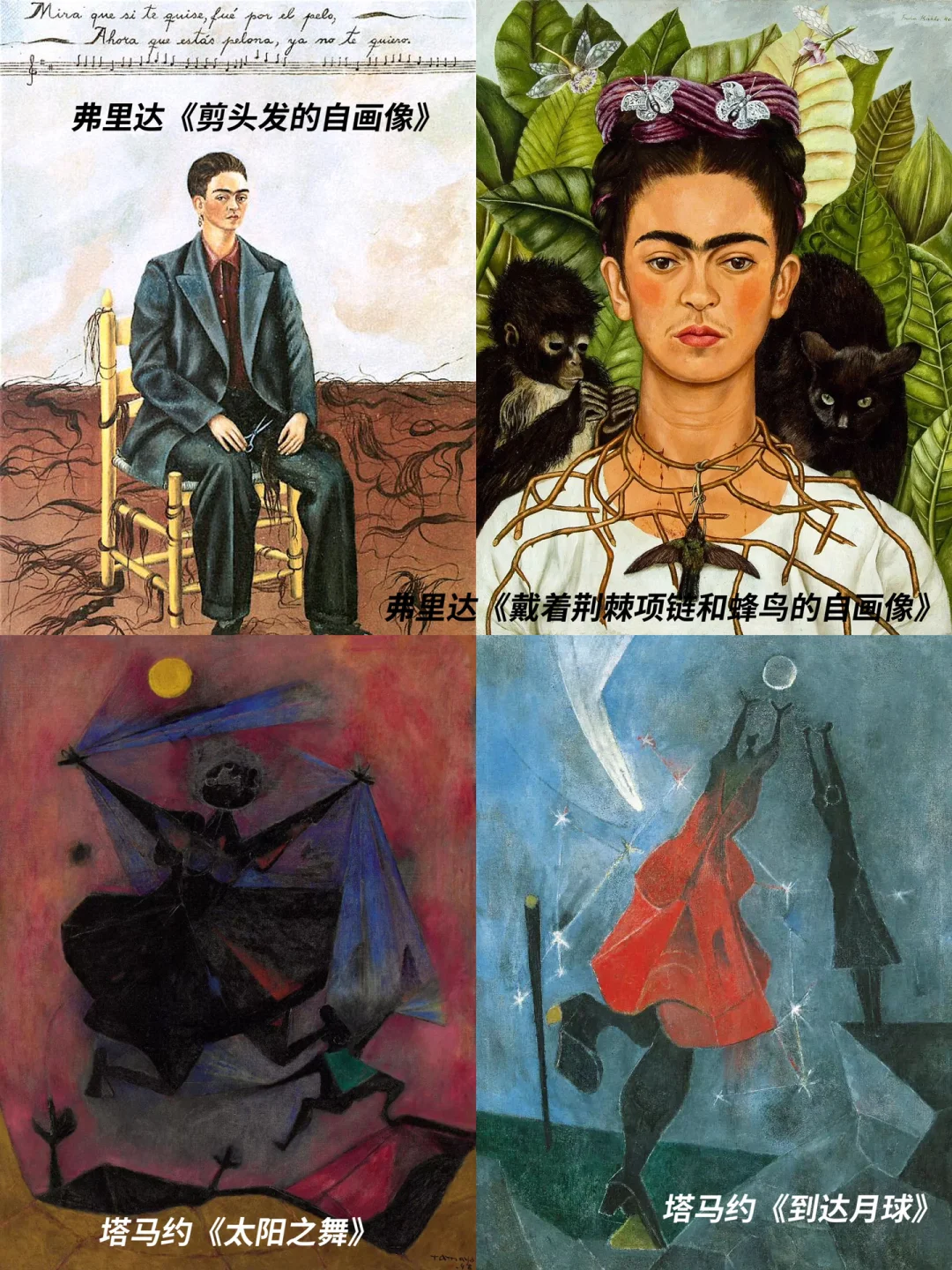-里维拉的妻子弗里达,同样是墨西哥著名画家。18岁时一场交通事故,令她一生都在与疾病对抗,她的画仿若一场诡谲压抑的梦。