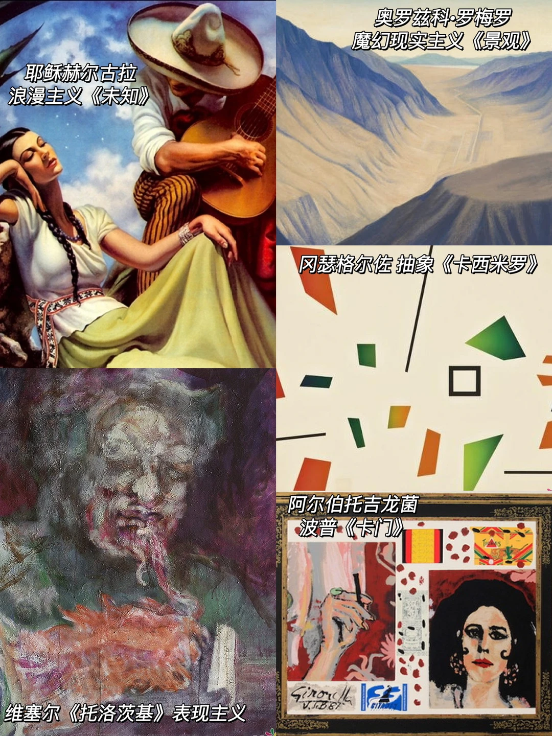 -在西方流派影响下,20世纪墨西哥艺术蓬勃发展。表现主义、浪漫主义、立体主义、抽象艺术、波普艺术等等,都在当地生根发芽,并开出带有拉丁美洲干燥气味儿的热烈之花。