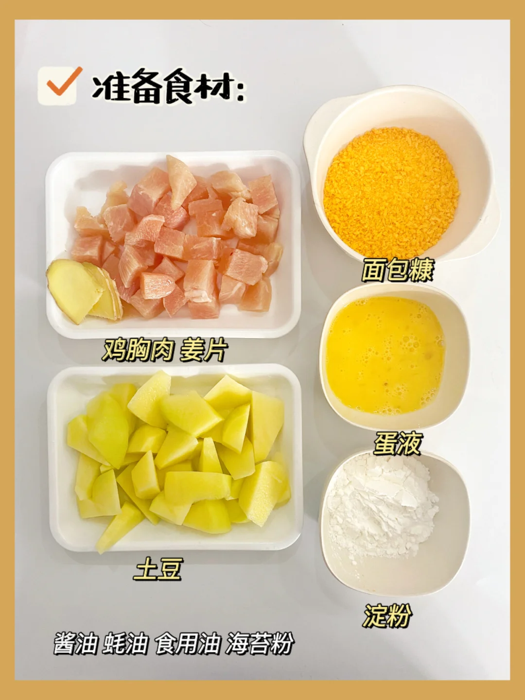 鸡肉、姜片、淀粉、蛋液、面包糠、酱油、蚝油