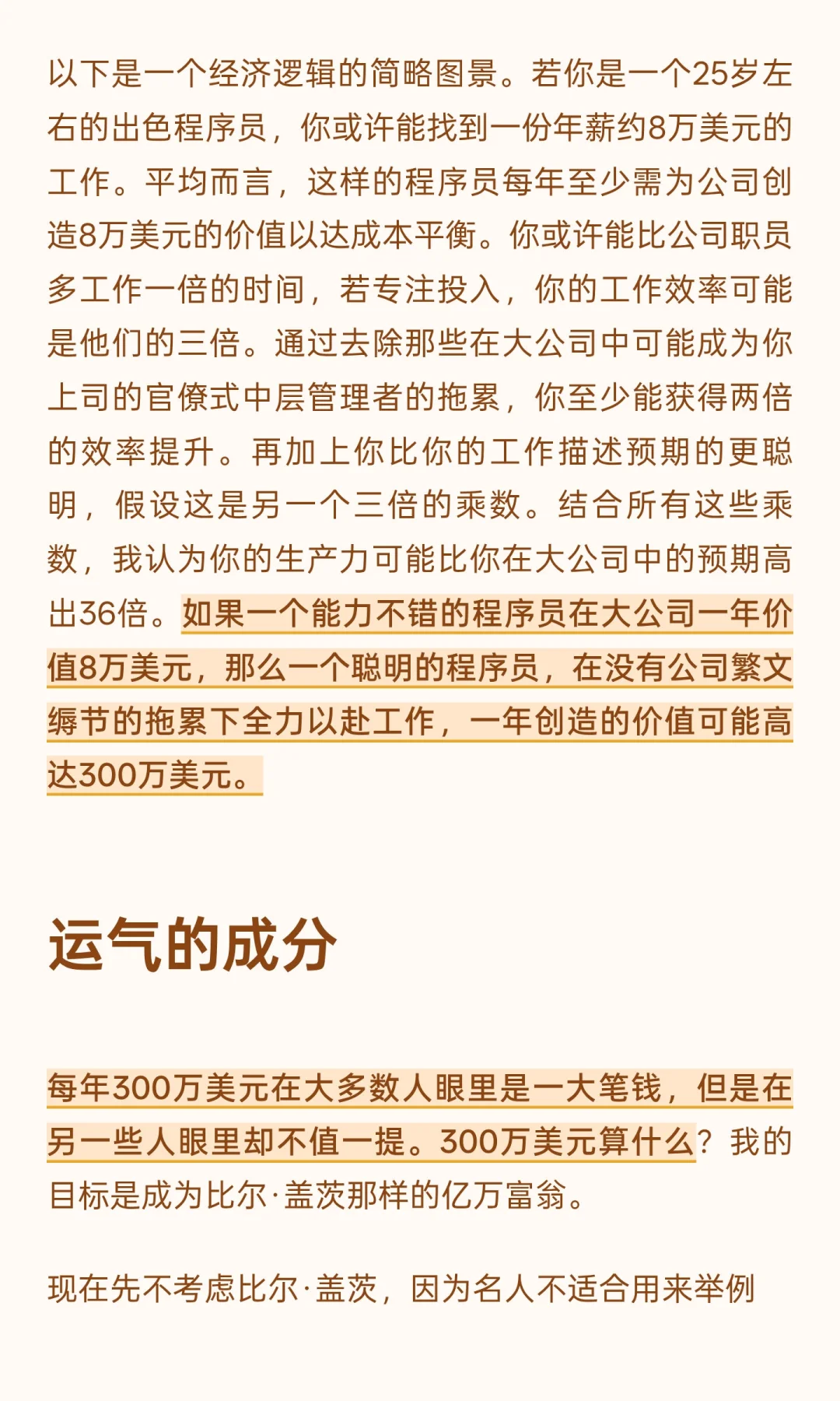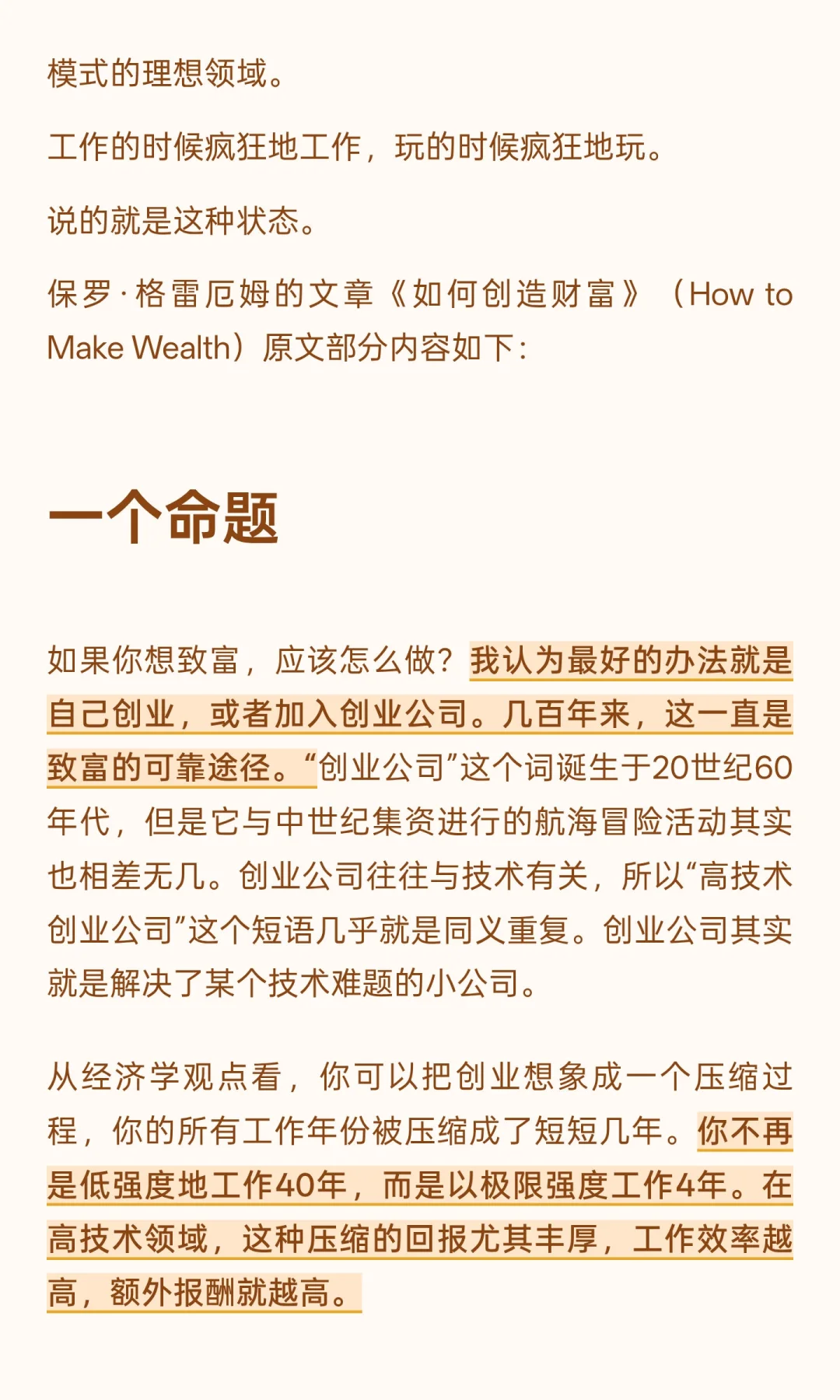 保罗格雷厄姆:创业通过高强度、短周期工作,实现财富积累效率,尤其在高技术领域回报丰厚。 创业压缩了传统工作年份,效率提升显著,成为致富可靠途径。 从经济角度来看,你可以将创业视为一种把整个职业生涯压缩到几年内的方式。你无需低强度地工作四十年,而是以自己最大的努力奋斗四年。这在科技行业的回报尤其丰厚,因为在这个领域,行动迅速的人能获得额外的收益。