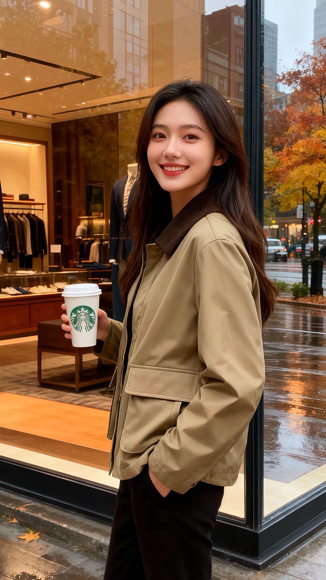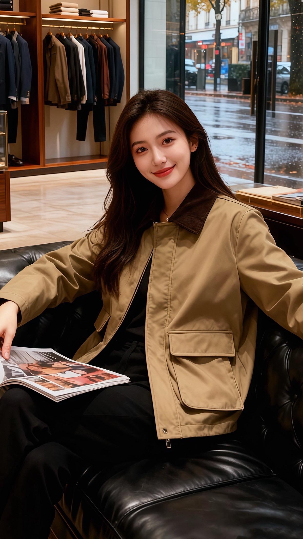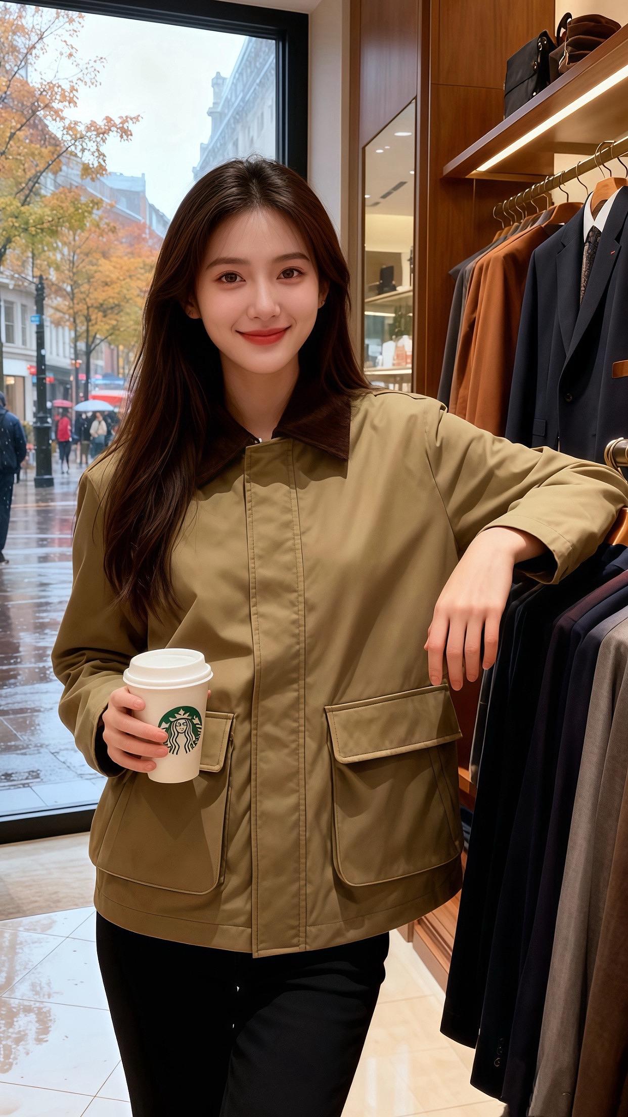 《秋装》 雨丝裹着梧桐叶的潮气漫进店门时,许妍正摸那件卡其外套的翻领——棕绒衬里软得像揉皱的秋阳。 皓明拎着咖啡走近,指尖碰过她袖口:“这版型刚好,你肩窄,这种落肩不显单薄。” 许妍转了转,口袋的弧度贴着手腕:“你怎么知道我喜欢这种不紧绷的款?” 他把咖啡塞她手里,眼底落着街景的湿光:“上次你说穿太挺的外套抬手费劲,这个口袋深,装钥匙也稳。” 窗外行人撑着伞走过,许妍摸了摸翻领的绒面,忽然觉得好穿搭从不是花哨,是像他这样,把妥帖藏在布料的细节里,像这杯热拿铁,刚好暖了秋雨天的风。