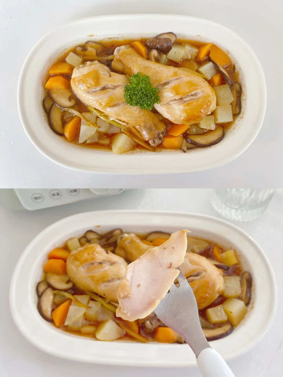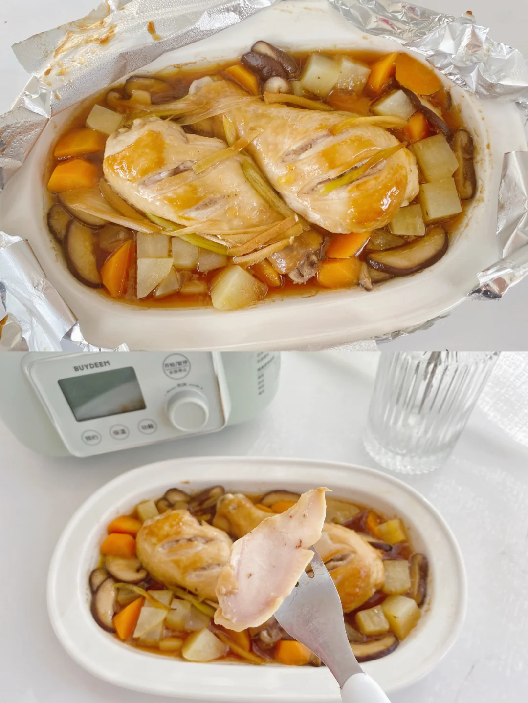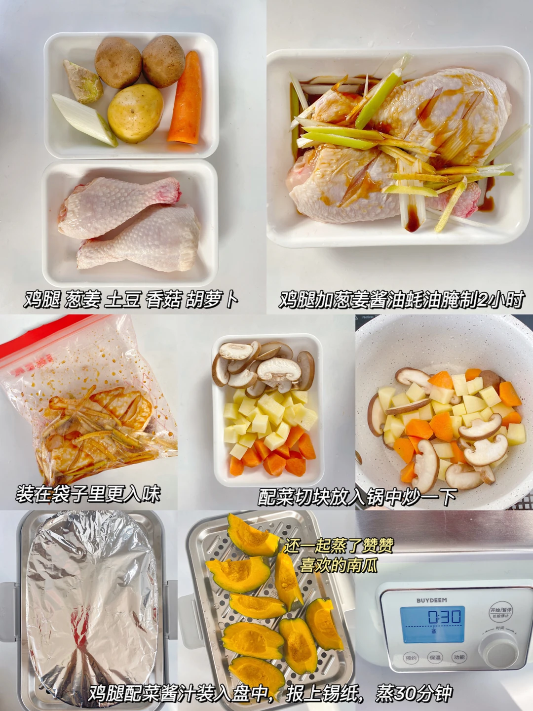3⃣️将腌制好的鸡腿和蔬菜码放到盘中,包上锡纸,上锅蒸30分钟左右就可以。我用的北鼎双层蒸锅,一层蒸鸡腿,一层还蒸了点赞赞爱吃的南瓜。蒸好后的汤汁也可以用来拌米饭,也很好吃。