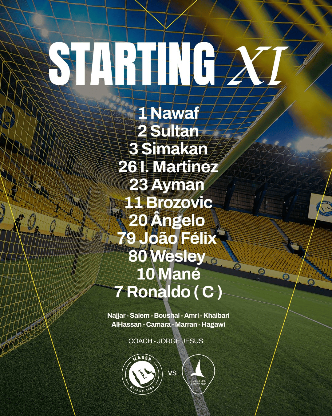 利雅得胜利首发:1-纳瓦夫-阿奇迪、2-加奈姆、3-西马坎、26-伊尼戈-马丁内斯、23-叶海亚、10-马内、20-安杰洛、11-布罗佐维奇、80-韦斯利-特谢拉、7-C罗、79-菲利克斯