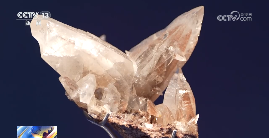 苗雨雁:目前在世界上已经发现的蝴蝶双晶,也就是在巴西和中国有产出。巴西产出的双晶,一个是颜色是白色,而且比较小,大概不会超过5公分。但是在我们国家湖南产出的双晶,虽然我们看到一簇一簇的不太大,但是晶体比较大,有的能达到10公分,这个是比较罕见的。另一个我们看它的颜色,也是有柔和的粉红色,粉红的像幻影一样。