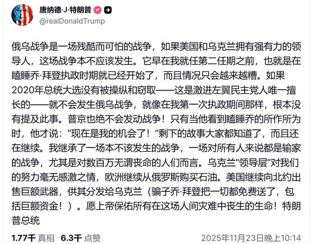 11月23日晚间,在美国高层官员与乌克兰代表团会面、试图斡旋俄乌战争之际,特朗普抨击乌克兰领导人,称他们对美方的付出“缺乏感激之情”。