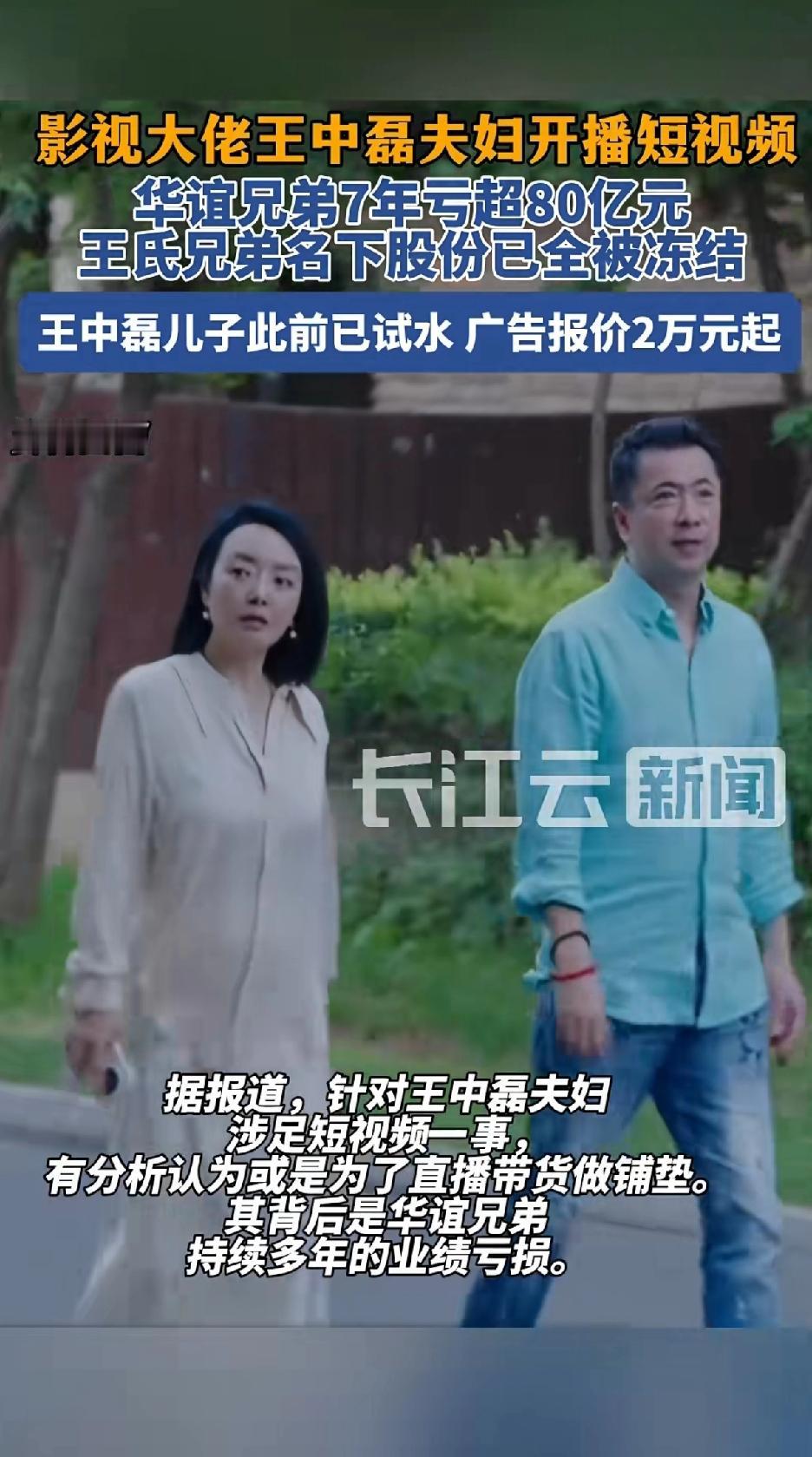 影视大佬王中磊、王晓荣夫妇开播短视频直卖货,王中磊儿子此前已试水广告报价2万起。 华谊兄弟7年亏损80亿元,王氏兄弟名下股份已被全部冻结。 2025年前三季度收入才2亿多,比去年降近一半,还亏1亿多。 最近王中磊夫妇涉足短视频,王中磊分享创业、电影相关,王晓蓉聊生活、子女教育。 目前两人全网粉丝约6万。本来就有知名度缺钱了,开播卖货是迟早的事。 名人卖货愿意买单的大把人在。
