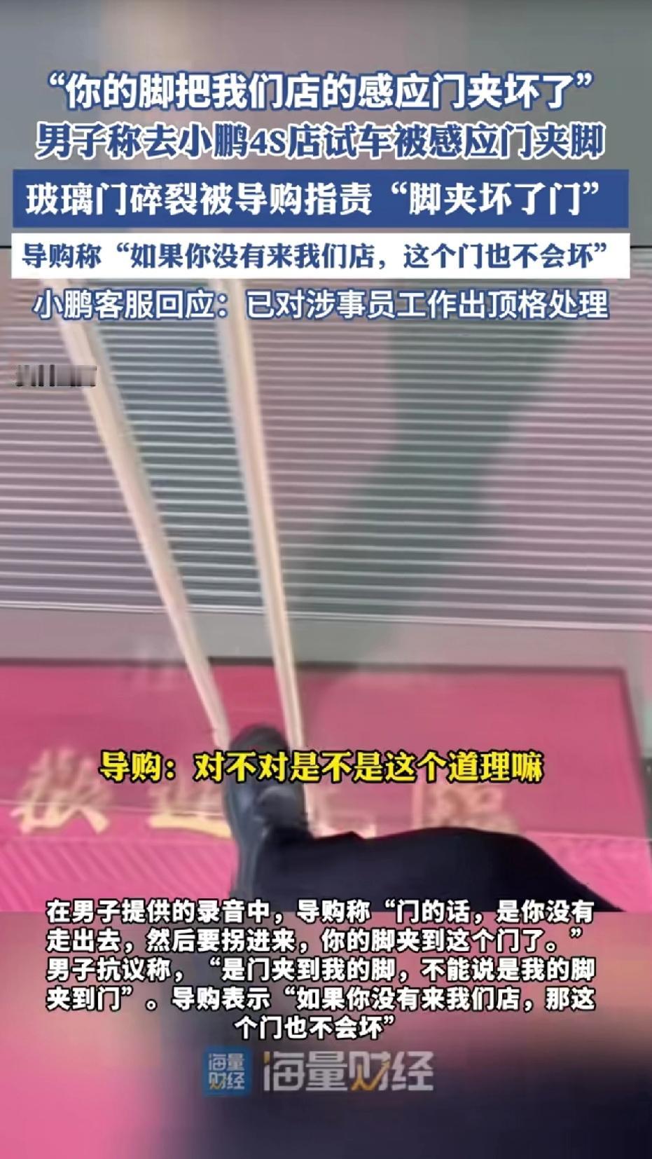“你的脚把我们店的感应门夹坏了”[笑哭][笑哭][笑哭]男子称自己去小鹏4s店试车被感应门夹脚。 店内导购:如果你没来我们店,这个门也不会坏![笑哭] 11月15日晚,男子在导购引导下到门口看试驾车,得知车被开走转头回店时,感应门自动合拢撞在他脚上,门脱轨边缘碎了。 男子走后,导购电话称是他“脚夹坏了门”,还要求协商赔偿。录音里导购坚称“你没走出去拐进来,脚夹到门了”“你不来我们店门也不会坏”,男子抗议“是门夹我脚”。 11月23日,小鹏汽车官方回应,涉事员工顶格处理,店长也受罚。 这事儿里,感应门出问题不先反思,反倒怪顾客,这导购逻辑也是绝了。
