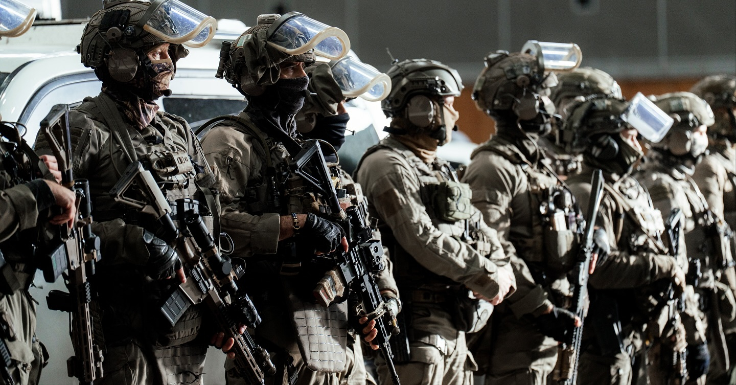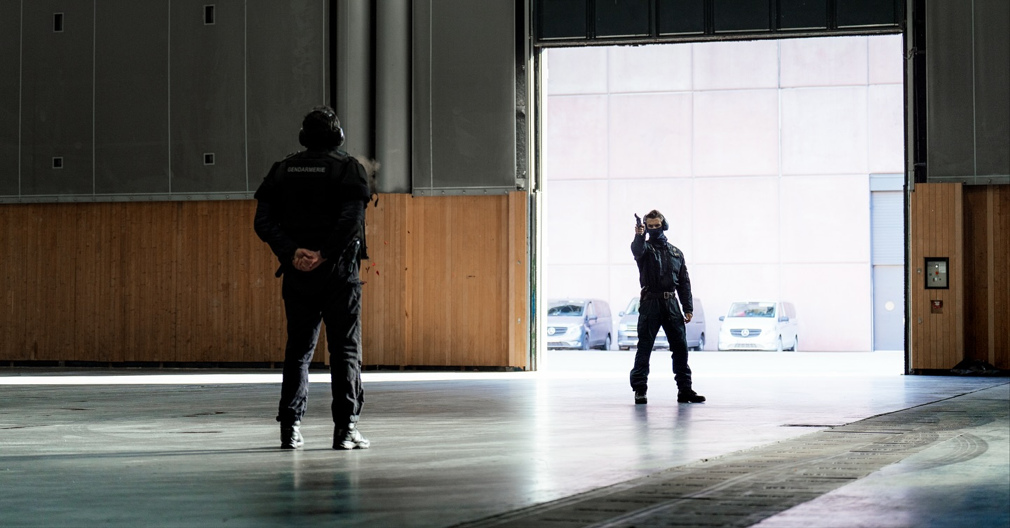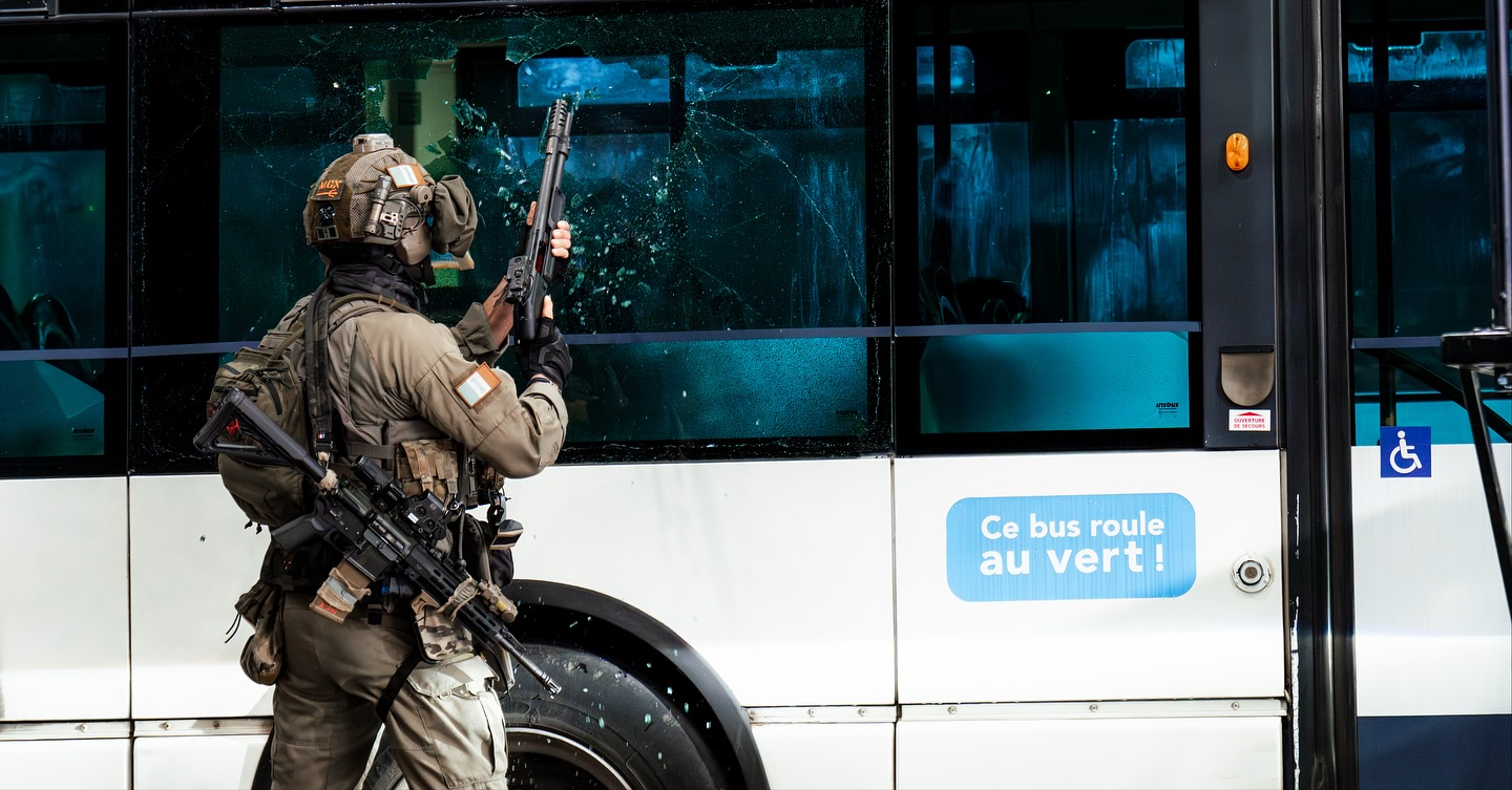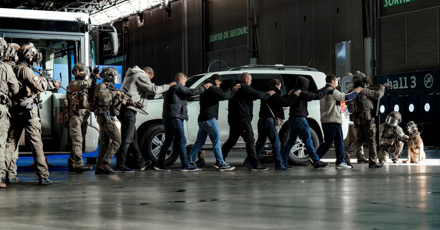 法国Milipol展会上进行公交车反劫持战术表演和信任射击表演的GIGN
