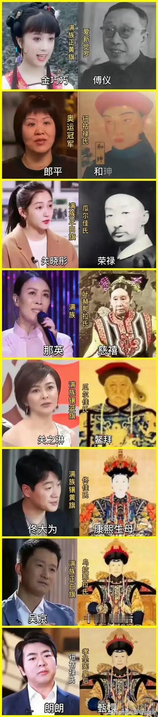 吴京说:我家祖上是多尔衮那支正白旗; 李宗翰:我家祖上是正黄旗爱新觉罗氏; 那英说:我祖上是满清皇族叶赫那拉氏; 关晓彤家祖上是满清正白旗瓜尔佳氏族; 汪苏泷是满族没有旗,大概率是汉改满; 沈傲君说,我先生是乾隆爷皇子的后代;佟大为家祖上是满族正白旗佟佳氏; 佟大为妻子关悦是满族正白旗瓜尔佳氏; 常远家里至今还延续着满族礼仪,走路脚怎么迈出去都有讲究; 娱乐圈满族明星还有白敬亭、郎朗、马丽、金巧巧、胡军、英达、于谦、文章、林依轮、凌潇肃、王丽坤、阚清子等等 港澳台地区满族明星有关之琳、周海媚、马景涛、齐秦、齐豫、尔冬升、惠英红…… 王中磊王中军汪小菲都是完颜氏后人,金国的完颜女真和建立大清的满族,血缘上是远亲,满族早期的名号就是“后金”,因此汪小菲也勉强可以算是满族。 另外,不能排除有些明星只是有满族血统但并不是满族,但是出于大家都能猜到的原因对外说是满族,或者外界传播的时候传成满族,但是有不少亲口承认自己去满族的,比如张兰就亲口说过,汪小菲是皇家子弟,是爱新觉罗的后代,出身贵族。 满族真是能人辈出,能歌善舞啊,直接占据了内娱半壁江山,你还知道哪些娱乐圈名人是满族的?[看][看][看]