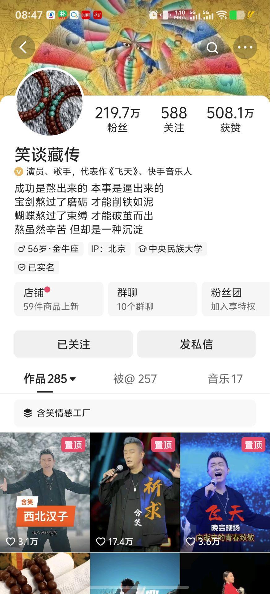 含笑的某社交平台信息显示,目前其账号已经从“含笑”更名为“笑谈藏传”,粉丝219.7万,发布短视频作品285个。其认证信息为演员、歌手。