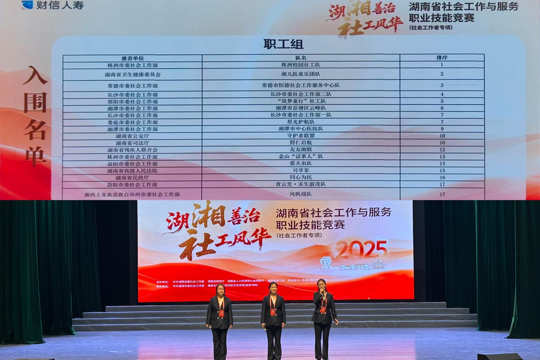 双清区融媒体中心11月21日讯(通讯员王海吉)11月20日,首届湖南省社会工作与服务职业技能竞赛圆满落幕。邵阳市双清区民政社工站社工姚玲玲、王梦璇及邵东石飞代表邵阳市委社会工作部(邵阳市选送参赛队伍)参赛,从全省58支队伍中脱颖而出,历经初赛、决赛的层层角逐,最终以笔试全省第五、综合成绩全省第七的优异表现,荣获竞赛三等奖!为邵阳市社会工作专业人才队伍建设再添佳绩。