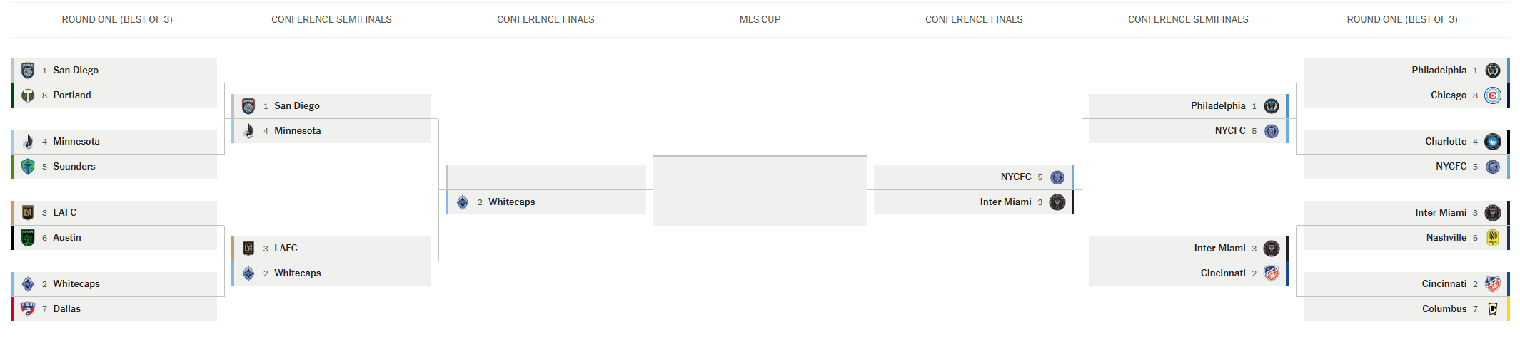 在MLS季后赛的这个阶段,比赛将采取单败淘汰制,常规赛战绩最佳的决赛队伍将获得12月6日MLS杯决赛的主场优势——决赛将于2026年世界杯抽签仪式后一天举行。
