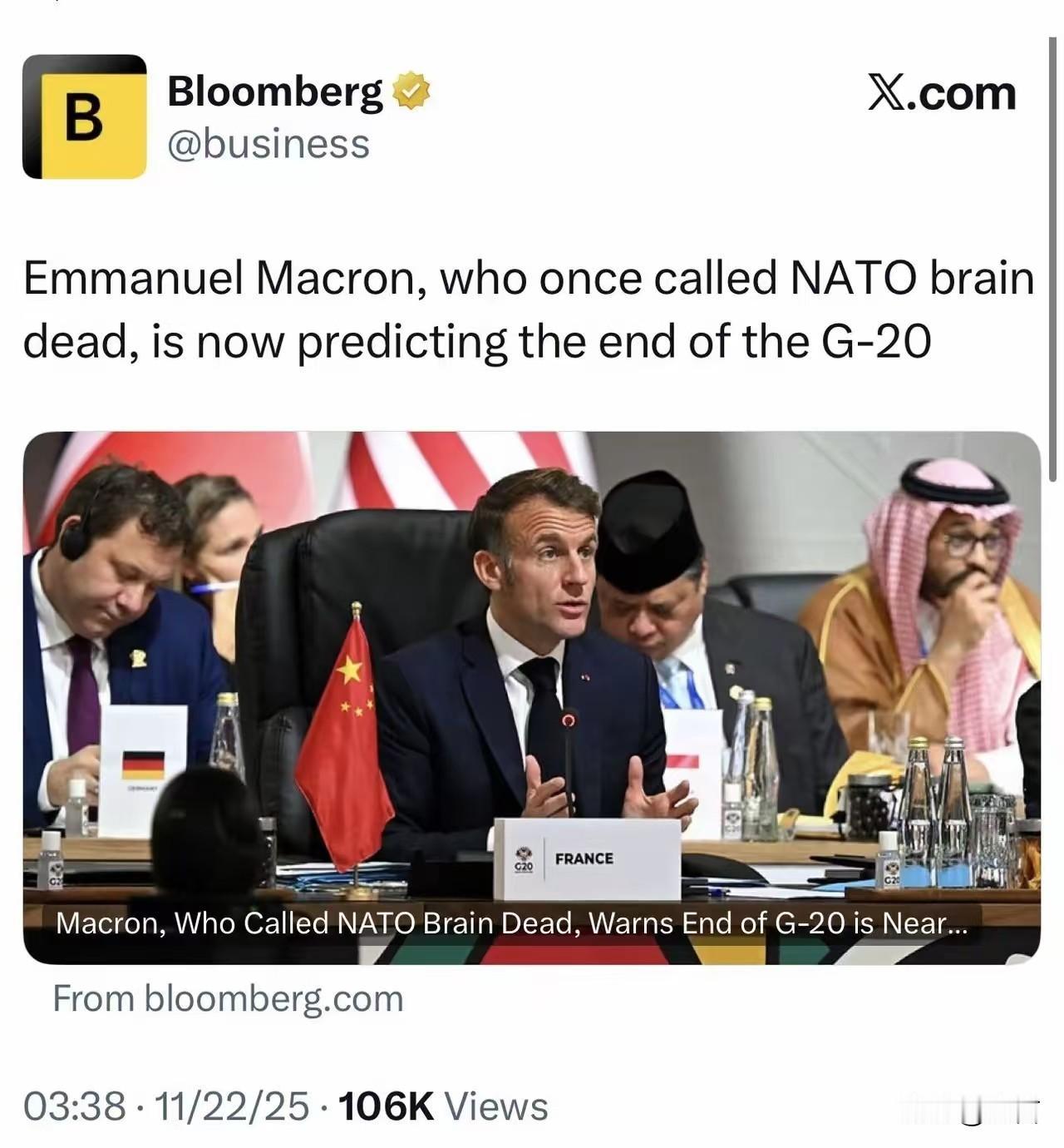美国没去,俄罗斯降级,马克龙预言G20濒临终结,G20峰会或沦为“小团体拉帮结派现场” 刚结束的南非G20峰会上法国总统马克龙直言:G20已步入“周期终结”,难以应对全球危机。引起争议。 但不得不承认,本次场峰最大的看点,或许已不是G20本身,而是各国在会场内外拉帮结派、抱团取暖的“碎片化”外交 其中最引人注目的是:“中等强国联合体”:韩国、墨西哥、印尼、土耳其、澳大利亚,在峰会期间另开小会 还有英法德等欧洲国家与日本私下就美国在乌克兰问题上会谈 近些年来由于美国的破坏,全球化退潮,小团体盛行,G20的衰败背后,是单边主义盛行与“全球南方”崛起的两极碰撞。 G20曾经是全球化的象征,如今却沦为尴尬的境遇,缺乏国际合作,全球性危机将由谁解决? 让我们遗憾的不是G20的衰落,而是人类文明已经到如此高度,依然不能和平共存,共同发展,造福全人类。