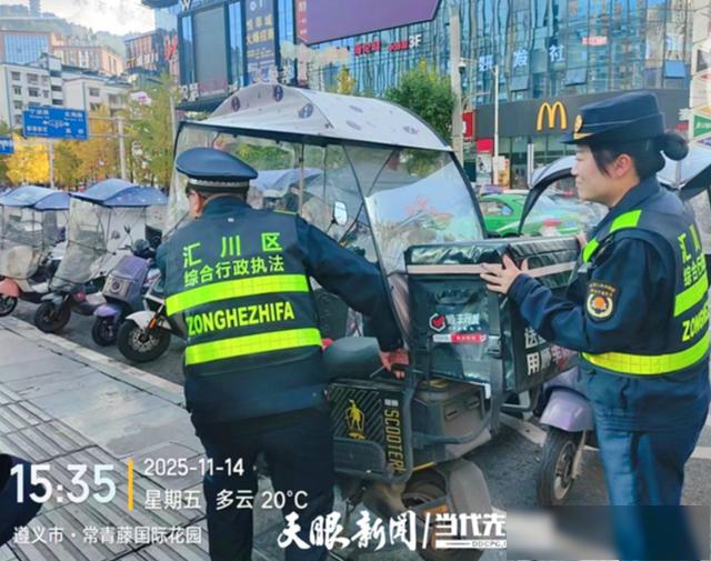 四城区综合行政执法部门积极落实整治要求。红花岗区自11月1日起开展为期三个月的专项整治,累计出动执法人员670余人,规范乱停乱放非机动车3430余起,补划非机动车停车位1443个;汇川区持续开展全辖区巡查整治,依法拖离电瓶车252台,新增停车位40个;播州区坚持"宣传引导为主,依法拖离为辅",劝导规范停放车辆1万余辆,拟新增停车位1720个;新蒲新区通过集中整治,强制拖离违规非机动车43辆,安装违停温馨提示牌2块。