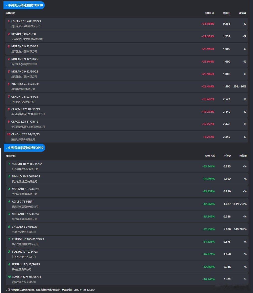 11月21日,中资美元债涨跌幅榜TOP10如下: