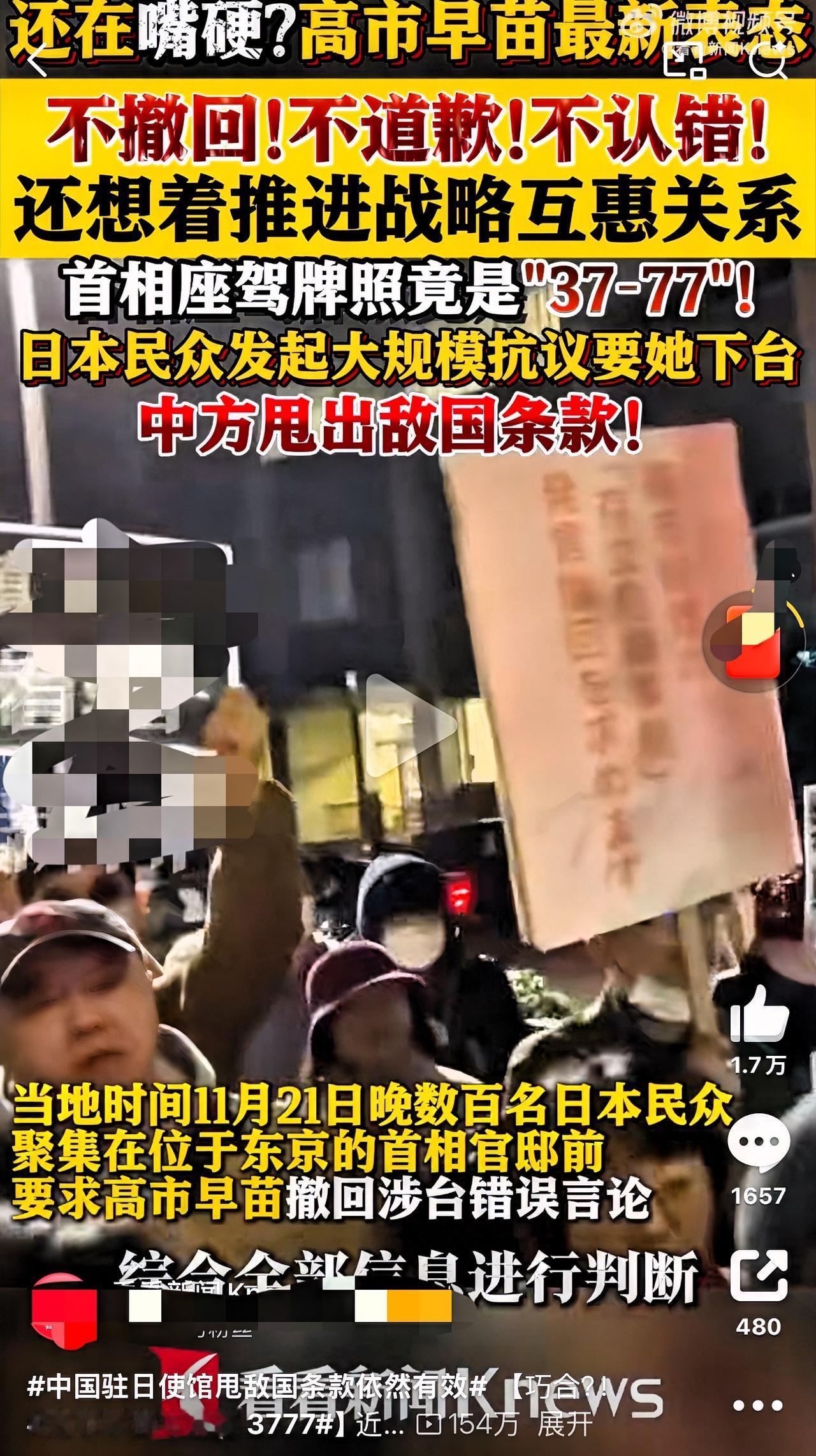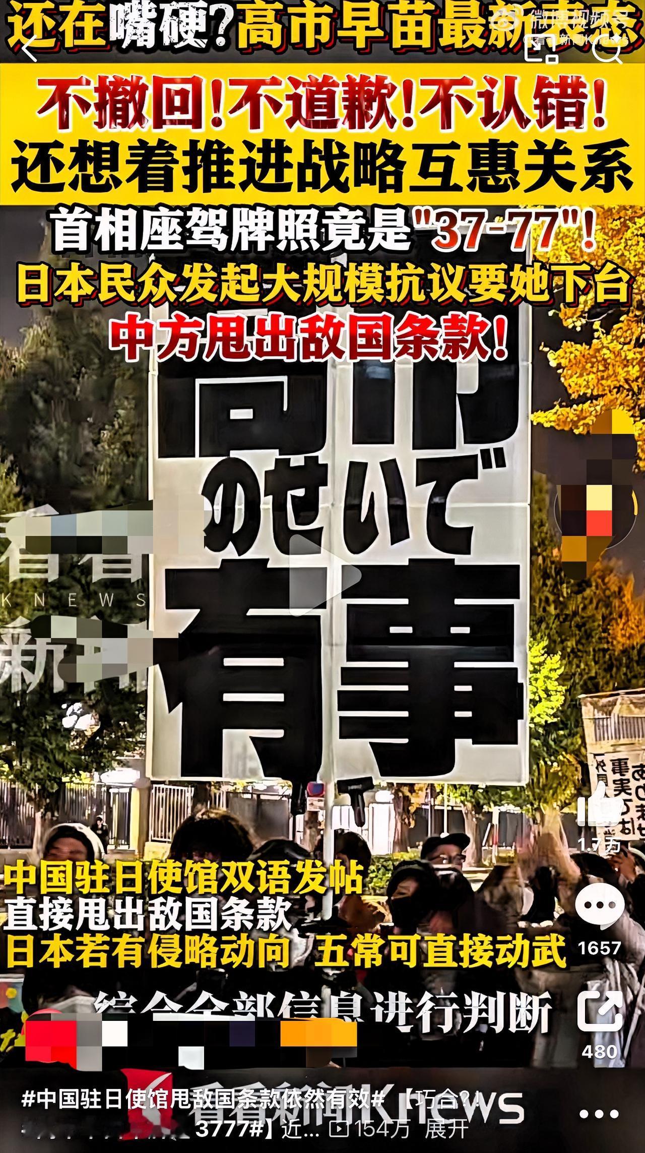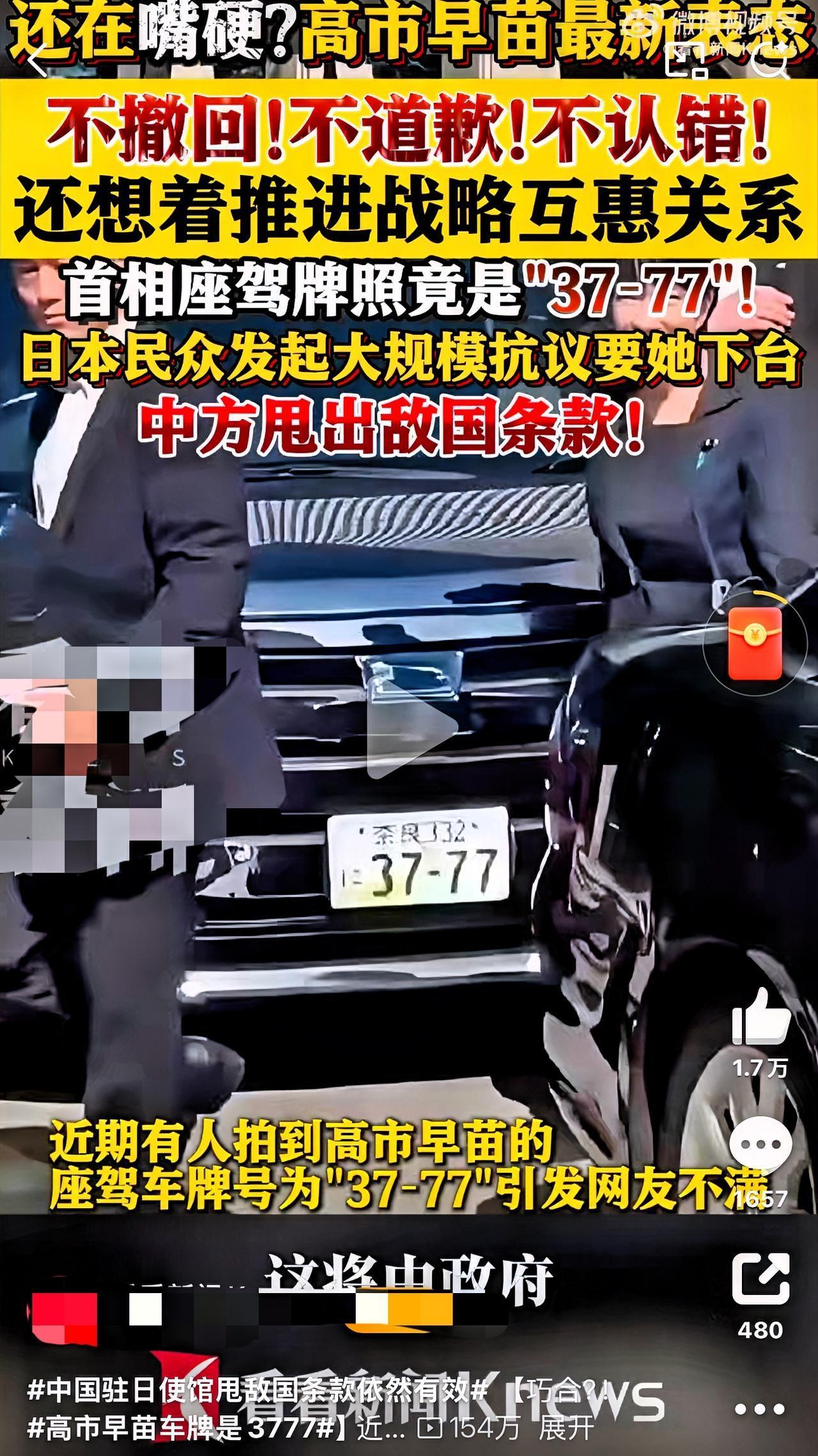 高市早苗座驾车牌号“37 - 77”迅速引发广泛热议,这一特殊号码在舆论场激起层层涟漪,成为大众关注焦点,各类猜测与讨论纷至沓来。东京首相官邸前,数百民众怒吼“撤回涉台错误言论”!中国驻日使馆当晚硬核亮剑,双语甩出“敌国条款”——若日方触碰侵略红线,五常可跳过安理会直接动武!车牌数字暗藏玄机?民众集会与外交回应形成双重震慑。这场政治风暴的深处,潜藏着日本政客对历史认知的严重扭曲。他们的不当行径,宛如一把利刃,无情地破坏着地区的和平稳定,着实令人忧心。中国驻日使馆甩敌国条款依然有效