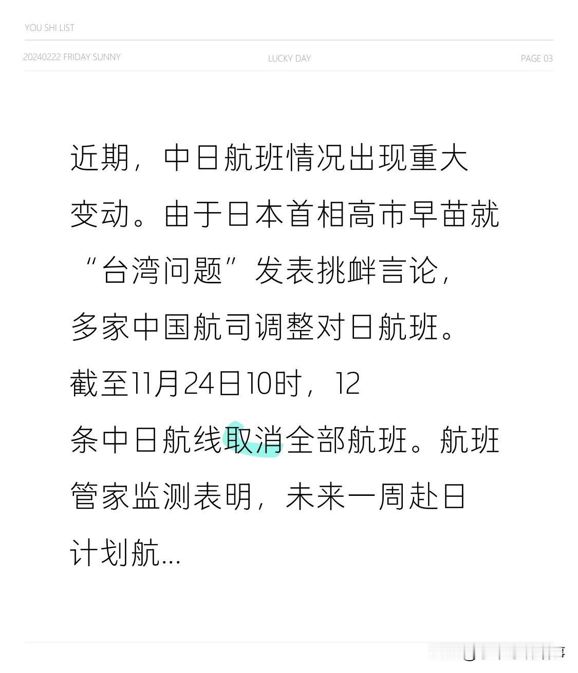 震惊!近期,中日航班情况出现重大变动。由于日本首相高市早苗就“台湾问题”发表挑衅言论,多家中国航司调整对日航班。截至11月24日10时,12条中日航线取消全部航班。 航班管家监测表明,未来一周赴日计划航班取消率12月27日将达21.6%,为1个月内最高。如天津滨海 - 关西国际取消率65.0%,南京禄口 - 关西国际59.4%。这影响赴日计划人群,也再次证明中国在主权问题上绝不妥协。