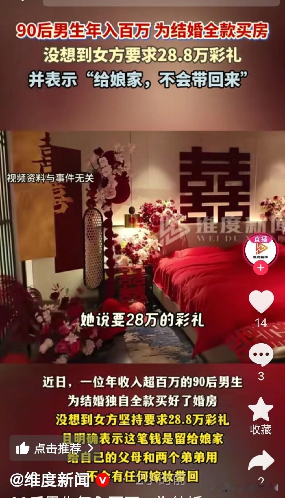 年收入超百万的“90后”男生为结婚独自全款买好婚房。结果被女方直言28.8万彩礼要全留娘家养俩弟弟,一分嫁妆都不带,这哪是谈婚论嫁,分明是把婚姻当成“扶贫”。 这看似是彩礼纠纷,实则是小家庭和女方原生家庭之间的一场资源争夺战。男生全款买房,本意是给未来小家一个安稳的起点,而女方却将彩礼明确定义为对娘家的单向补给,这让婚姻的根基从“共同奋斗”滑向了“单向输血”。婚恋导师对此一针见血:健康的婚姻关系,必须坚持“先经营好小家,再帮扶大家”。倘若一方在结婚伊始就将资源输送的优先级完全倒向原生家庭,那新生的家庭便如同建在沙土上,难以稳固。 这种现象背后,往往藏着“重男轻女”的陈旧逻辑。女儿在无形中被物化成娘家的“移动ATM”,婚姻变成了一场“劫贫济富”的算计。那个在工地攒下三十万血汗钱却发现被妻子拿去给弟弟买房的男人,他的悲剧警示我们,当亲情变成捆绑式的索取,婚姻里最基本的信任便会土崩瓦解。这不是婚姻该有的模样,婚姻本应是遮风挡雨的屋檐,而不是吸血续命的工具。 值得深思的是,现代婚姻越来越需要夫妻二人成为并肩作战的“合伙人”。它追求的是精神上的同频共振与责任上的风险共担,而非一方对另一方家族的无限度奉献。那位选择领证后才以夫妻名义买房的男士,他展现的担当恰恰说明:真正的诚意,是主动将双方的利益捆绑在一起,给伴侣实实在在的保障与安心。婚姻的真谛在于势均力敌的扶持,而非单方面的慈善扶贫。 各位读者你们怎么看?欢迎在评论区讨论。