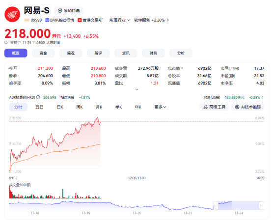 上证报中国证券网讯(李子健记者周亮)11月24日,网易-S股价高开高走,截至11:28分,公司股价上涨6.55%,报218港元。