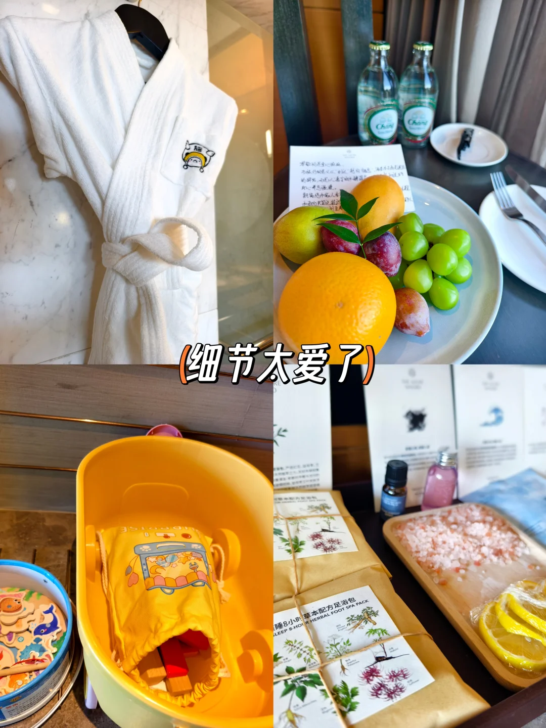 入住送儿童洗漱包(含牙刷牙膏、小拖鞋),儿童小浴袍、蒸汽眼罩、足 浴包、泡澡精油。周末还有亲子手作活动
