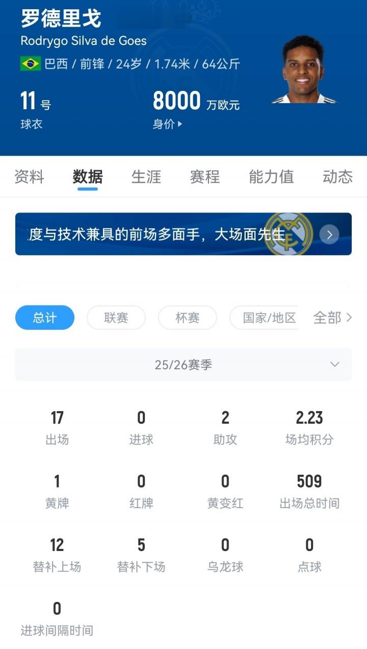 本赛季至今,罗德里戈为皇马出战14次共计416分钟,仅有4次首发,送出2次助攻,目前德转身价8000万欧。
