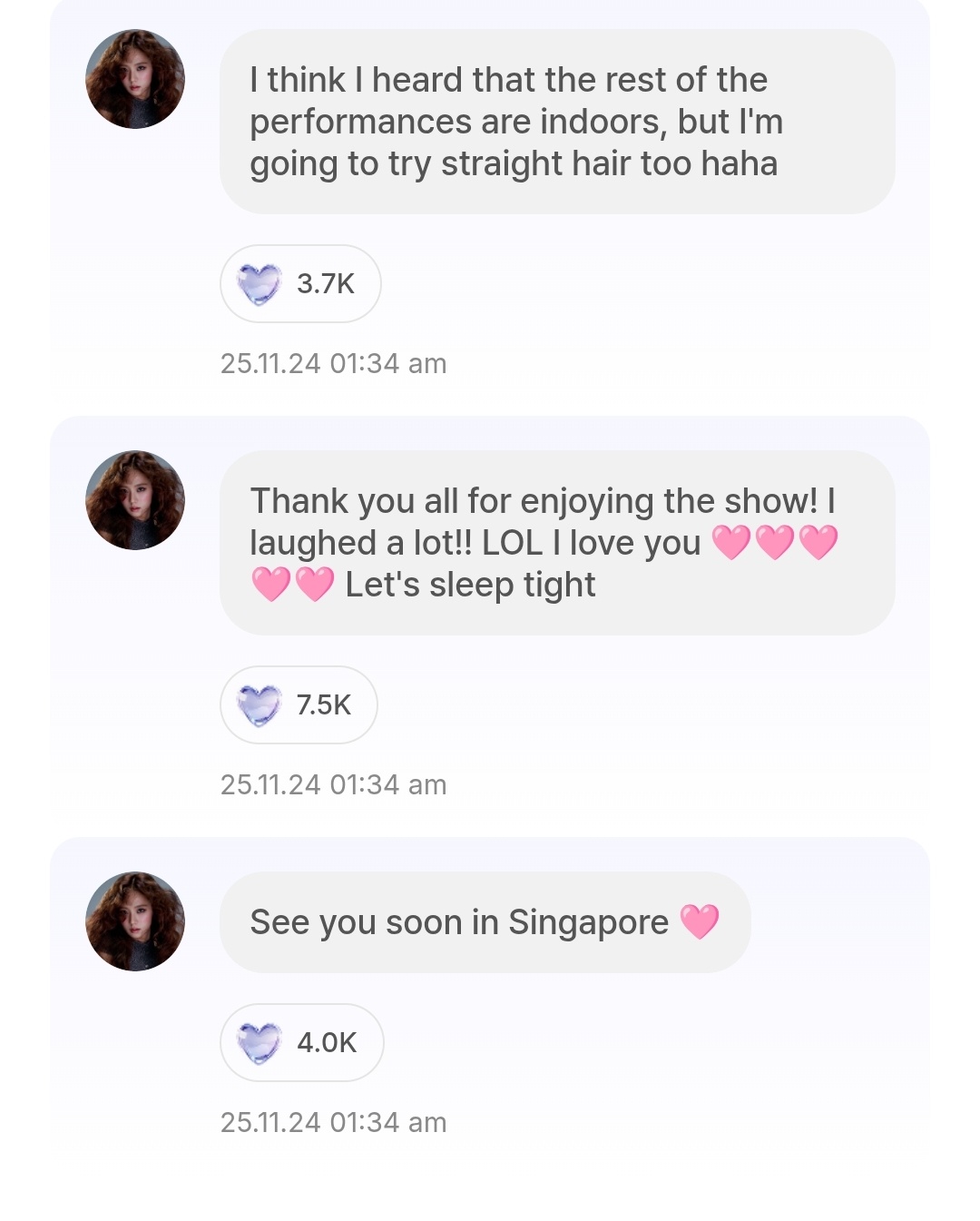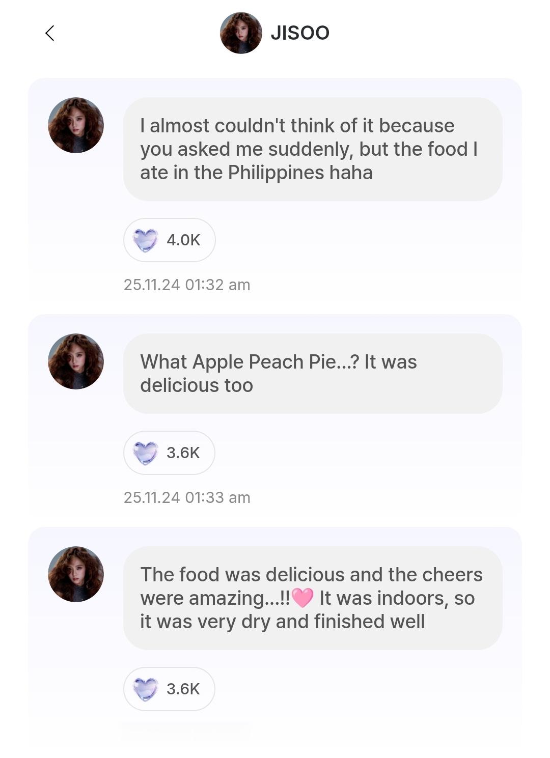 251124 Jisoo App聊天室更新💬“因为突然问我所以差点想不起来,这是我在菲律宾吃的美食哈哈”“还有什么苹果桃子派…?也很美味”“食物很美味,欢呼声也很棒!因为是在室内,所以很干爽,很好的结束了演唱会。”“我听说剩下的演唱会都在室内,但我也会尝试直发哈哈”“谢谢大家喜欢这场演出!我笑的很开心!!LOL我爱你们🩷🩷🩷🩷🩷晚安好梦。很快在新加坡见🩷”