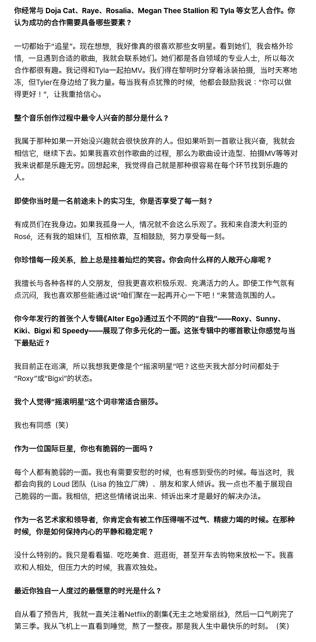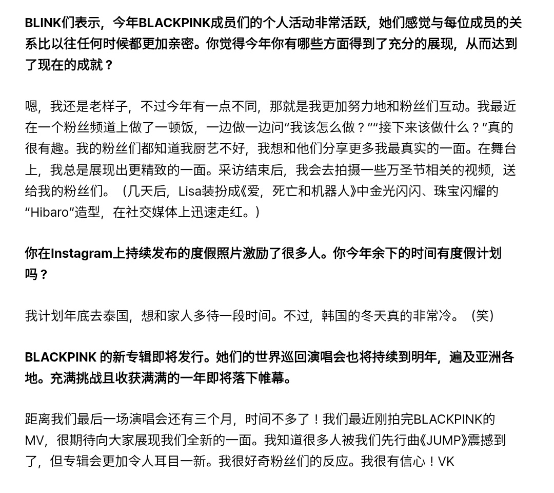 251124 Lisa for Vogue Korea采访完整版🐣“VK:BLACKPINK 的新专辑即将发行。她们的世界巡回演唱会也将持续到明年,遍及亚洲各地。充满挑战且收获满满的一年即将落下帷幕。Lisa:距离我们最后一场演唱会还有三个月,时间不多了!我们最近刚拍完BLACKPINK的MV,很期待向大家展现我们全新的一面。我知道很多人被我们先行曲《JUMP》震撼到了,但专辑会更加令人耳目一新。我很好奇粉丝们的反应。我很有信心!”期待期待!!!