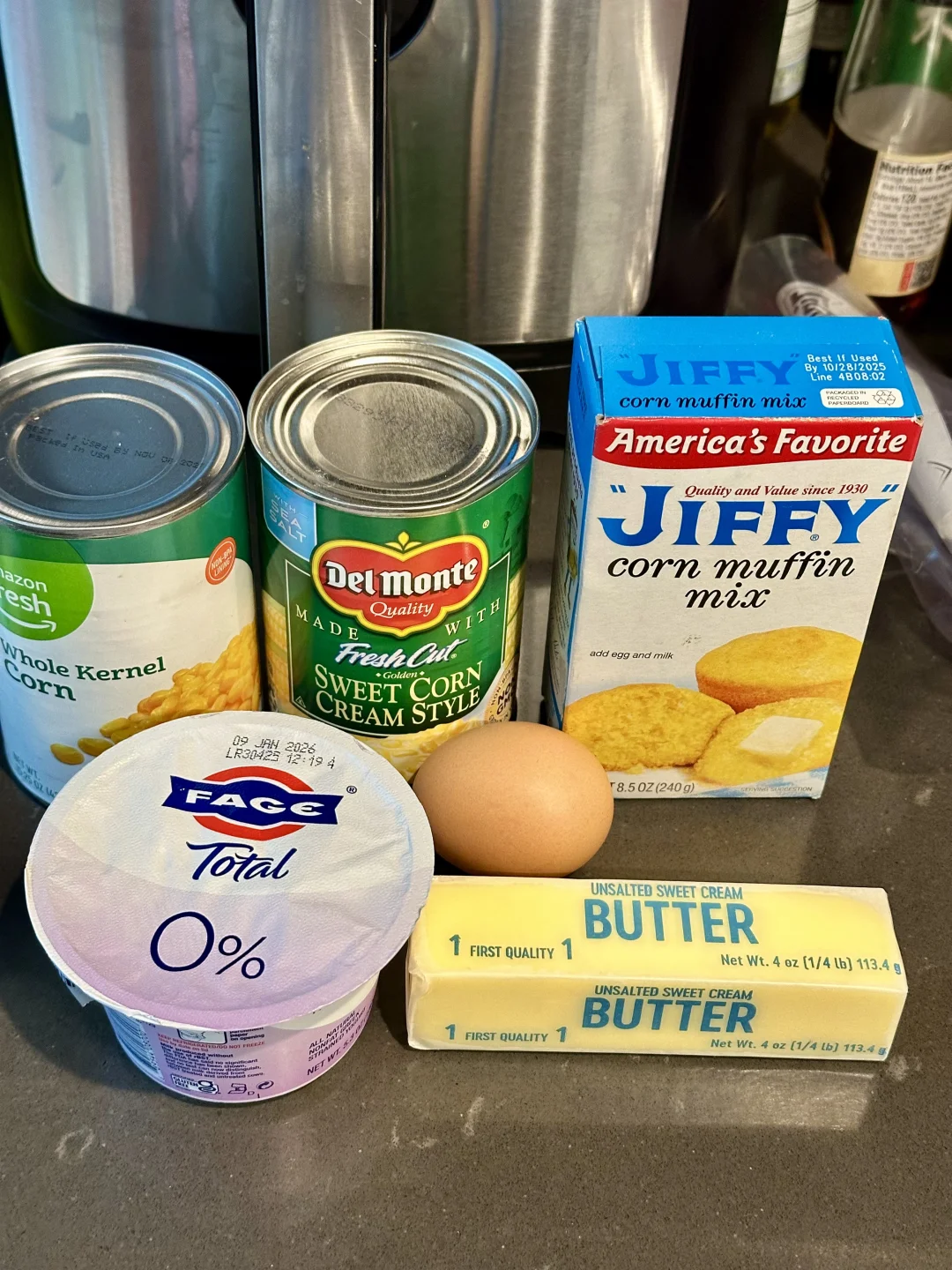 鸡蛋一颗,酸奶油1cup,黄油4tbsp,滤干水的15oz玉米粒一罐,玉米泥creamed corn15oz一罐,一盒8.5oz的corn bread预拌粉。