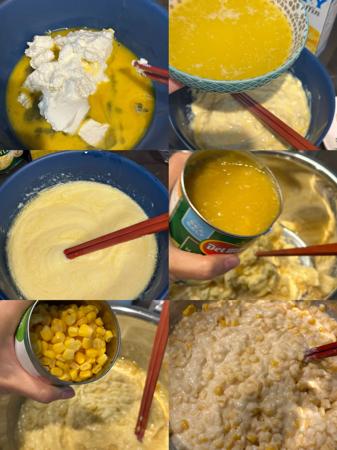 ✏️以上食材美国普通超市里都能找到。玉米预拌粉推荐用jiffy的,因为刚好一小盒一次性用完,但缺德舅之类的也可以用。