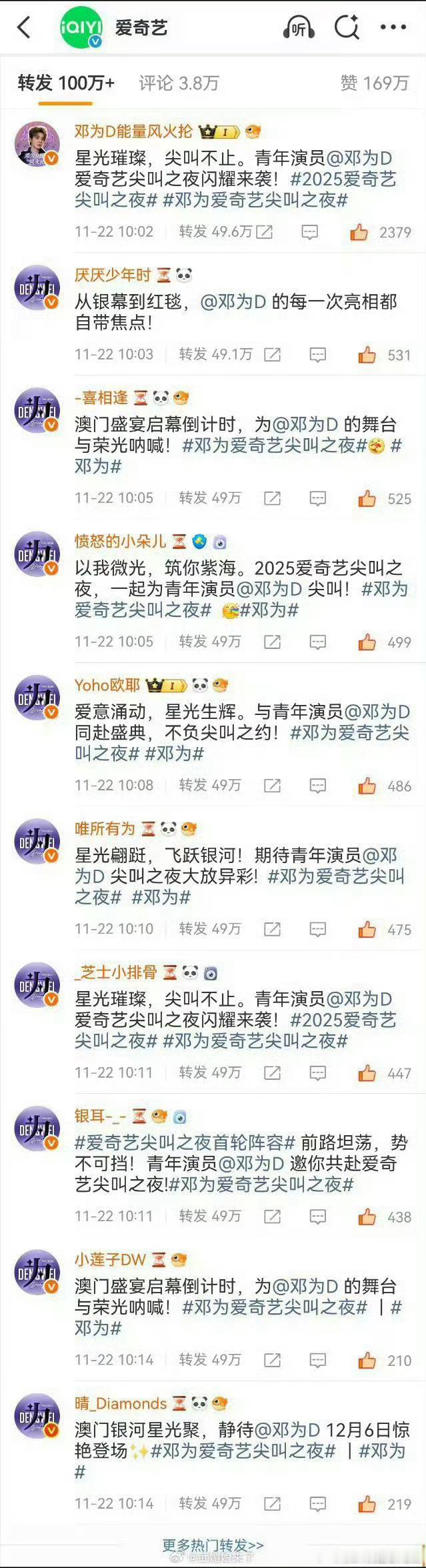 邓为粉丝有一种浑身牛劲无处安放的亢奋感,在爱奇艺下面都排上字了,别家粉丝也没这样,有一种用力过猛的感觉。为啊,你但凡有粉丝一成努力你猫咪姐今天都不点你名了