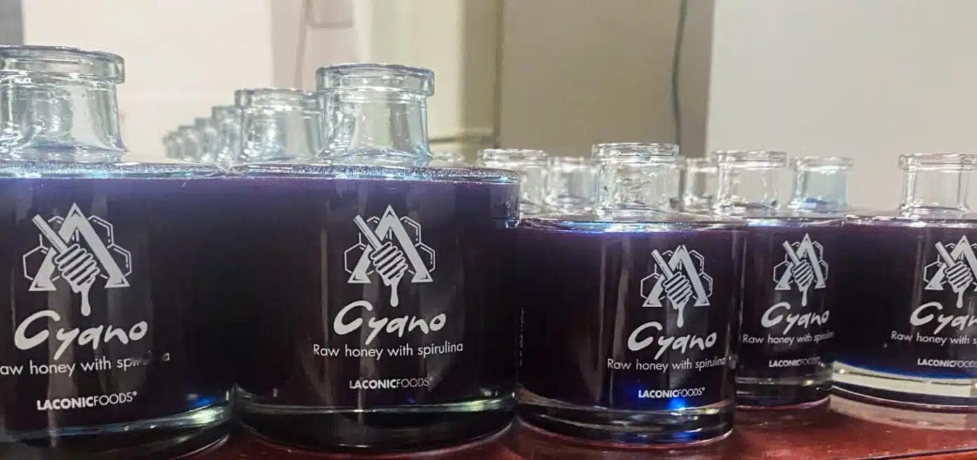 图1就是蓝色的蜂蜜,跟传统金黄色🍯差异很大。¹ 因为加了螺旋藻,准确说是螺旋藻蓝色色素浓缩物。98%蜂蜜+2%螺旋藻色素浓缩物。² 图2:希腊一个公司在推。
