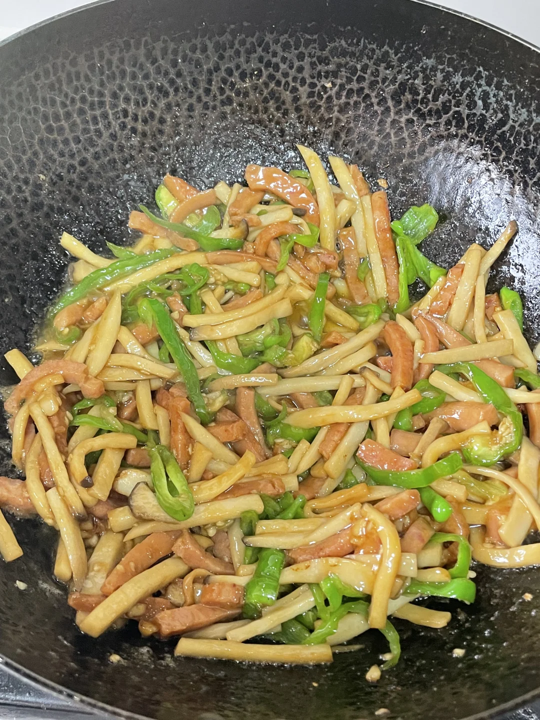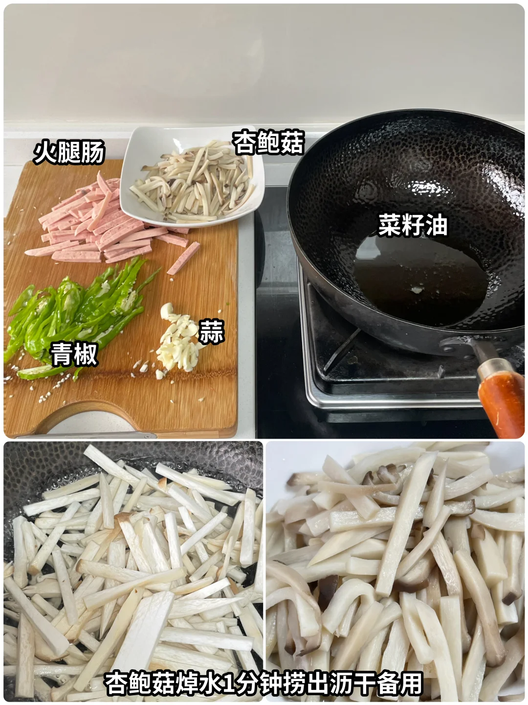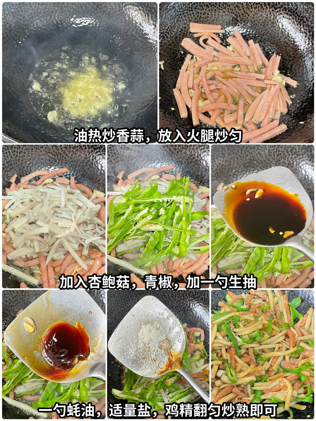 3⃣️起锅烧油,油热将蒜炒香,放入火腿翻炒均匀炒香,加入焯好水的杏鲍菇、青椒翻匀。调味,加1勺生抽,1勺蚝油,适量的盐,鸡精翻匀,将青椒炒熟即可出锅。