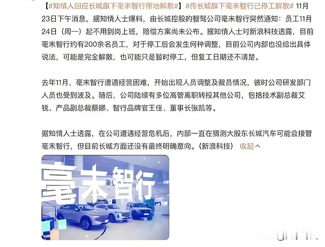 又一个估值超10亿美元行业巨头倒下 员工爆料:今日起公司停工放假,复工时间未知,欠薪已超2个月,领导层尚没有任何解释,内部群已经被禁言! 📝据相关新闻报道揭露: 毫末智行,专注于自动驾驶解决方案 背后有长城汽车、首钢基金、高瓴创投、九智资本等投资机构,估值超10亿美元 👱知情员工还透露: 关于停工放假原因,员工之间流传的说法是对赌失败,有诉讼导致公司账户被冻结。 有谁会想得到,这个一度风光无限的自动驾驶独角兽,说倒就倒了。 可怜底下那几百号员工,好不容易熬到年底,不仅2个多月工资不知道什么时候才能拿到手,还要面对突如其来的“停工放假,复工时间另行通知”😂😂 资本是转身离场了,但普通打工人的生计却被晾在了半路上。 (消息来源:红星新闻)