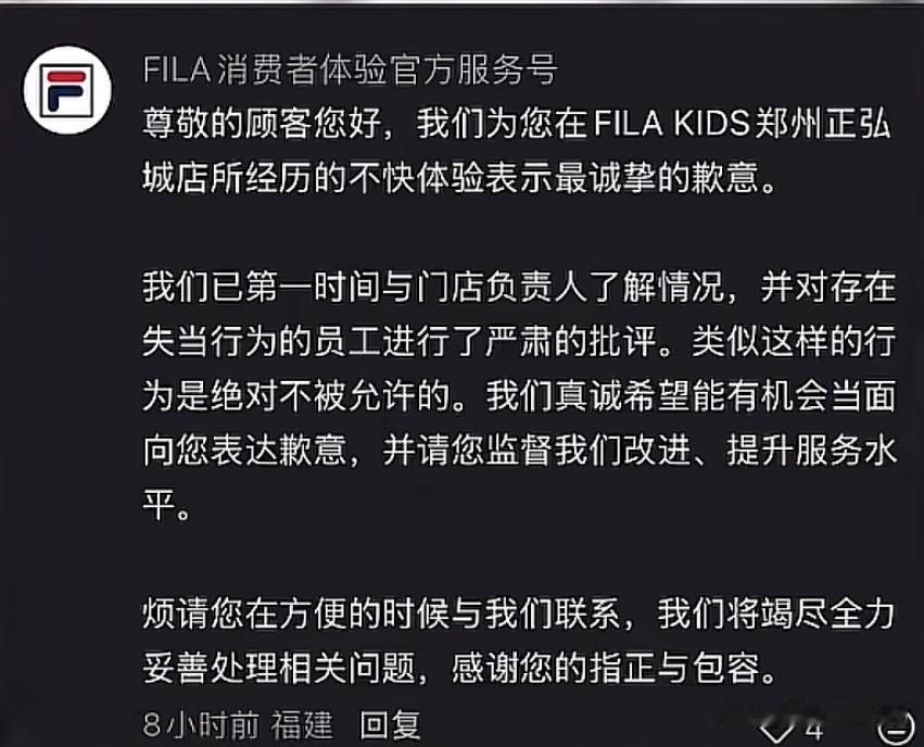 这些店员是不是忘了,自己是来服务的,不是来当评委的? 近日,河南郑州,一位女子爆料在斐乐买鞋结果被店员打上非常不尊重人的备注引发网友关注。 据该女子表示,试了三双鞋买了一双,从进店到付账不到十分钟,按店员的建议用了优惠券,结果回头发现自己的会员信息被备注“买双鞋子都嫌贵”,截图还被丢进了会员群。 更绝的是,店长不仅没解决问题,还反手就把群解散了。这年头,花钱买东西还得先过店员这关? 事情闹大后,FILA立马道歉说已经批评了涉事员工。但网友的怒火可没这么容易平息:一句不痛不痒的“批评”能顶啥用? 而且这种事情也不是第一次发生,前段时间还有网友在阿迪某斯维权被店员怼“拿钱过年”,某鹏4S店的导购更离谱,门夹了顾客的脚,反咬一口“你不来门就不会坏”。说白了,就是把职业身份当成了高人一等的资本,殊不知离了品牌光环,谁认识你是谁? 最讽刺的是,同一家店的店员还给另一位顾客备注“绑定奥莱,不能用就换老公注册”。看来这是内部的传统了。用优惠券就是抠门?多试几双鞋就是事儿多?品牌的溢价里,难道不该包含对顾客最基本的尊重吗? FILA在道歉信里信誓旦旦说“类似情况绝对不被允许”,可光靠批评员工显然治标不治本。如果品牌只顾着冲业绩,忽视服务培训;只跪舔VIP,却对普通顾客爱搭不理,下次贴的标签可能就是“嫌便宜”“事多精”了。 消费者买的从来不只是商品,更是体验。再大的牌子,也经不起店员这么败好感。顾客花了钱还生了一肚子气,在网上几块钱的东西,客服还一口一个亲的,先不说东西好不好,最起码的情绪价值给足了。 无论买什么东西,顾客都有权挑挑拣拣——花自己的钱,轮得着别人指手画脚?店员手里的键盘能贴标签,但贴不掉一个事实:服务行业的核心,永远是“人”而不是“价”。 对这件事您怎么看呢,欢迎表达您的观点。