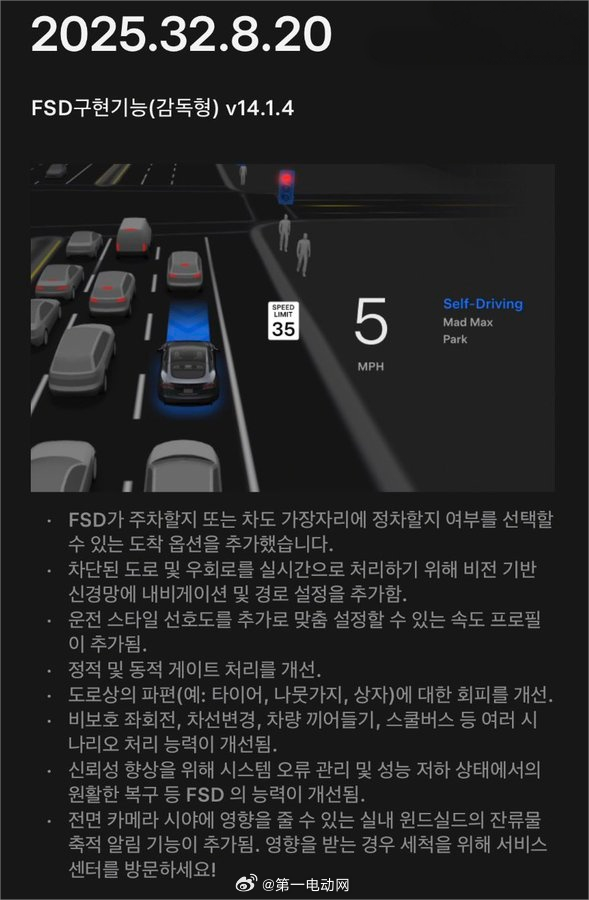 特斯拉FSD正式落地韩国,全球落地国家总数增至七个(已在美国、波多黎各、加拿大、中国、墨西哥、澳大利亚和新西兰)昨日,韩国特斯拉车主已开始接收FSD软件推送,当前推送版本为v14.1.4(比中国版本要高不少了。。。。),虽然不是最新版本,但也是特斯拉近期广泛推送的重要版本之一