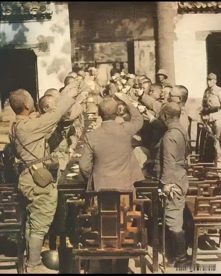 这么多日本鬼子围在桌子前,手里好像是举着酒杯,嘴里好像还在嚷嚷着什么,这应该是在搞一个庆祝仪式,不像是一次普通的吃饭喝酒。日本鬼子在侵略我们的时候,是非常猖狂的,是非常野蛮的,是非常凶残的,它们给我们造成的苦难,超过了任何一个侵略我们的列强,这一点必须要永远铭记!