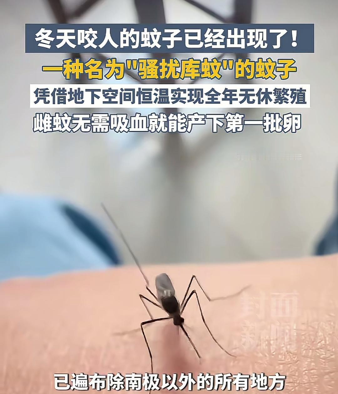 冬天咬人的蚊子,一种名为骚扰库蚊的蚊子,已经遍布地球上除南极洲之外的大洲,会同时叮咬鸟类和人类,这让原本仅限于鸟类群体的病原体,会传播给人类。几年前刷段子,看到说有专家研究出耐寒蚊子,填补了冬天没蚊子的空白,当时只当是个玩笑,万万没想到真有了,好了,以后一年四季防蚊虫叮咬。
