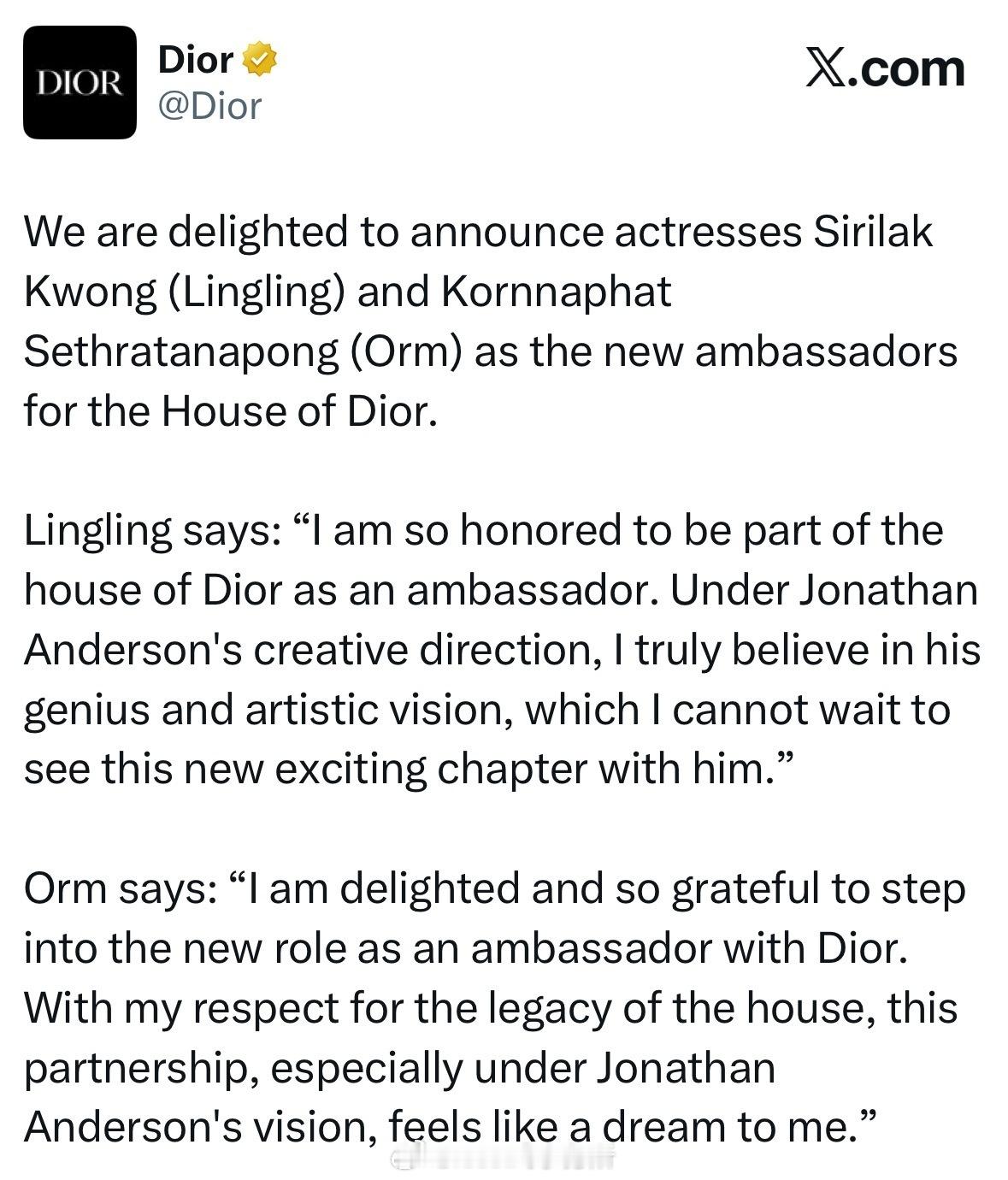 迪奥官宣邝玲玲和Orm全球品牌大使,泰百第一且唯一吧,也是他泰为数不多的奢牌全球大使