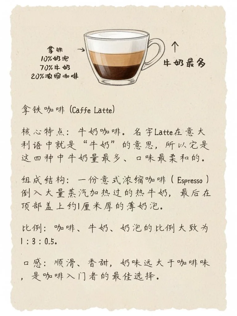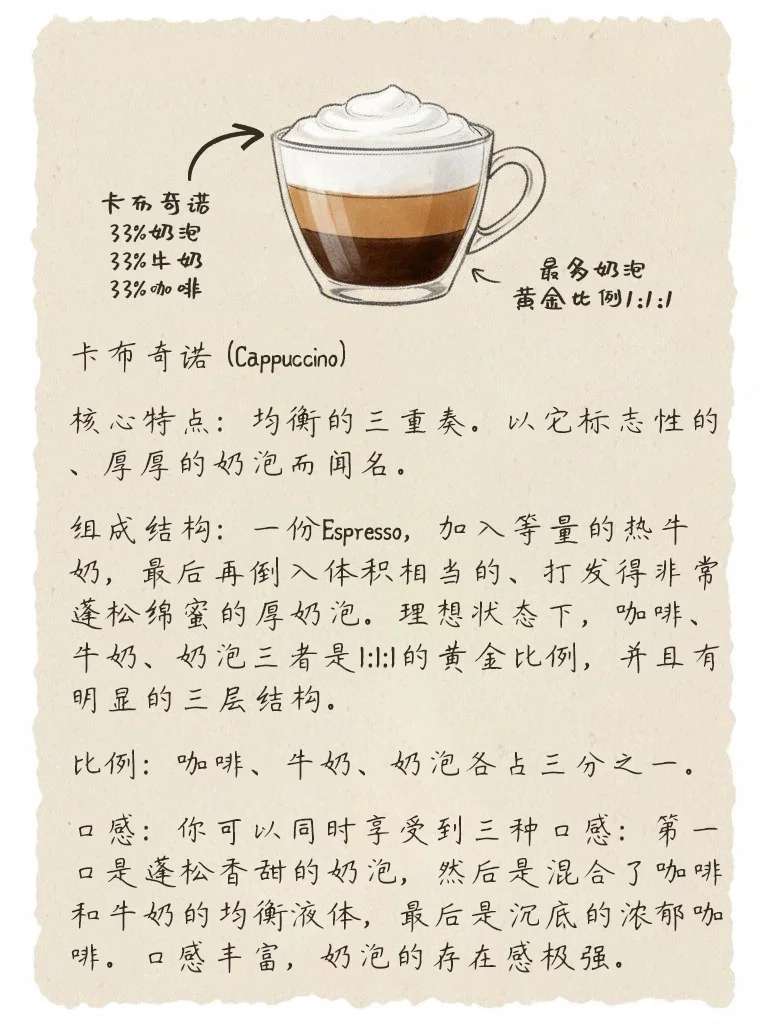 核心特点:均衡的三重奏。以它标志性的、厚厚的奶泡而闻名。