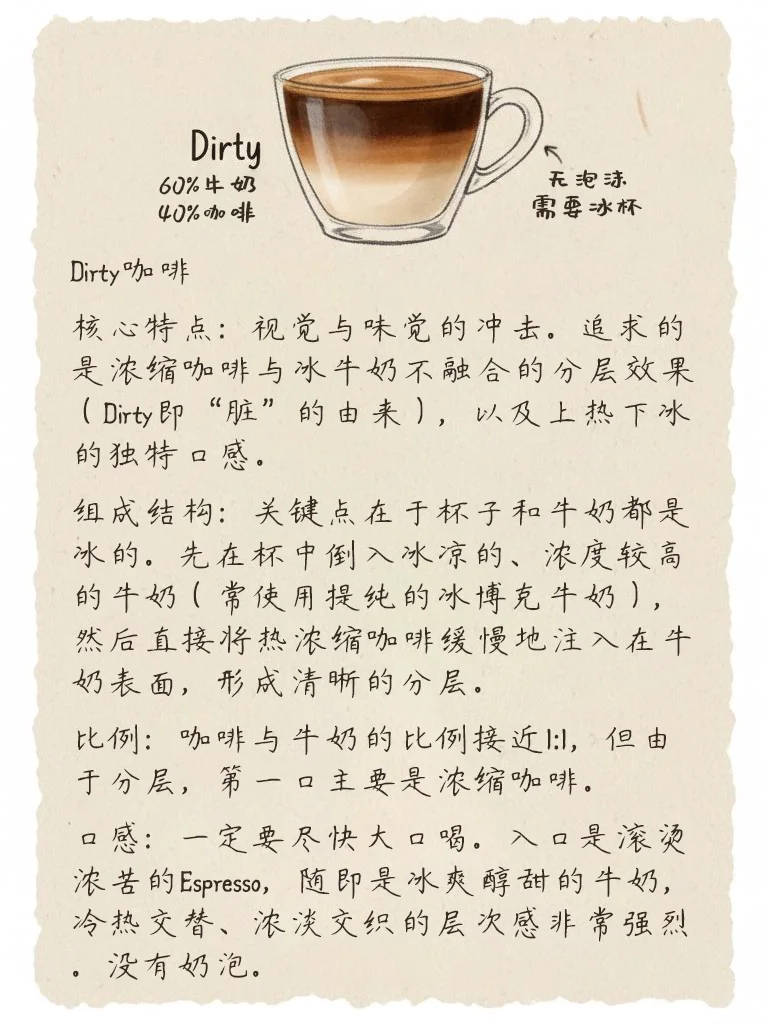 核心特点:视觉与味觉的冲击。追求的是浓缩咖啡与冰牛奶不融合的分层效果(Dirty即“脏”的由来),以及上热下冰的独特口感。