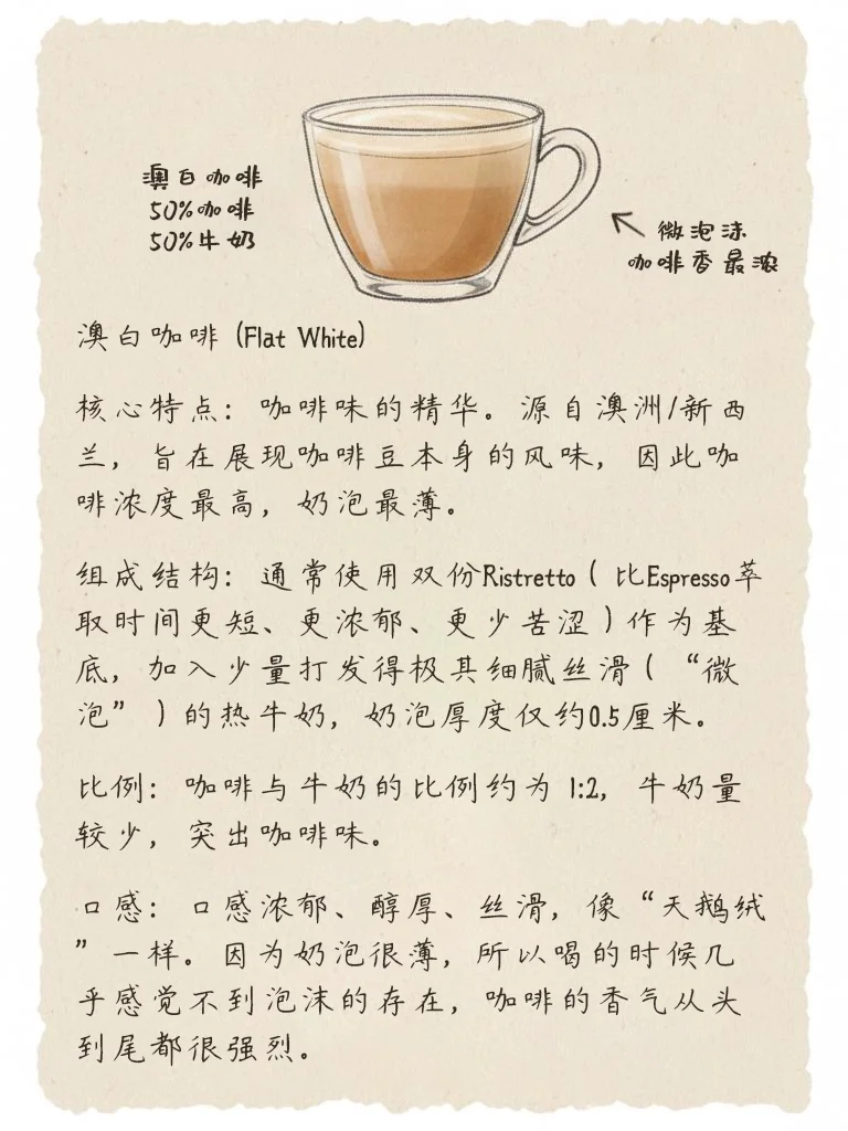 核心特点:咖啡味的精华。源自澳洲/新西兰,旨在展现咖啡豆本身的风味,因此咖啡浓度最高,奶泡最薄。