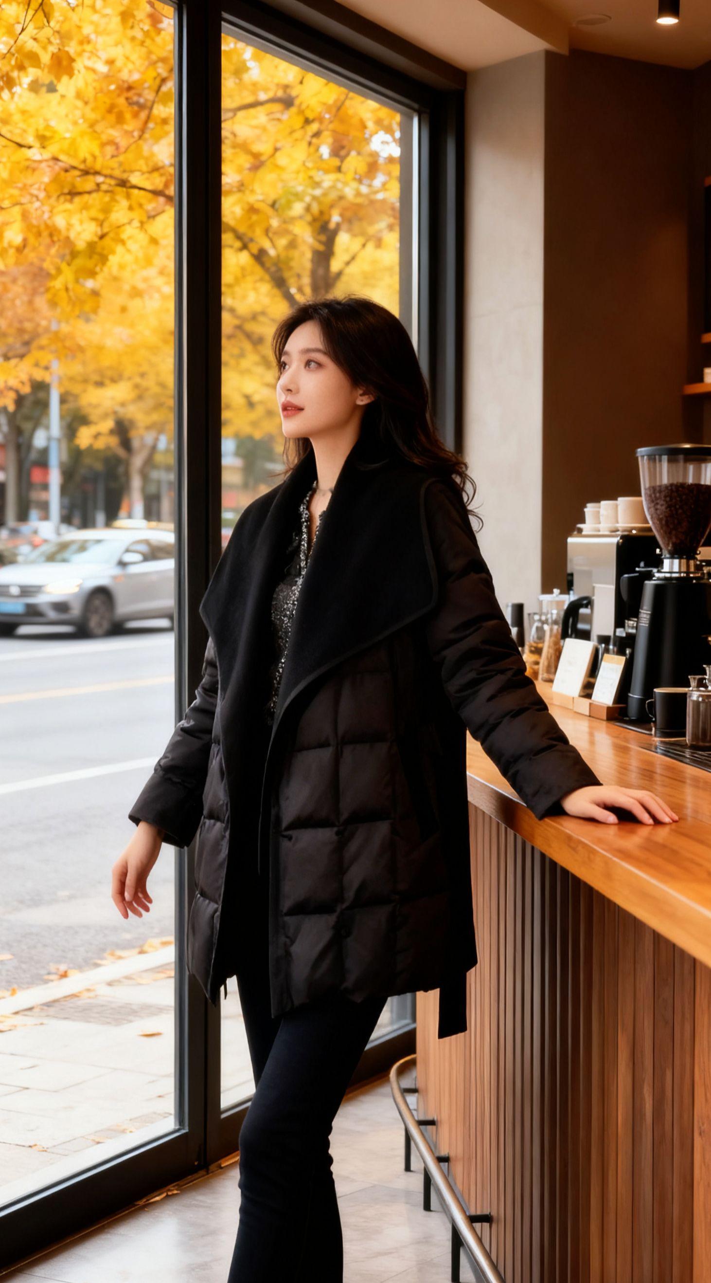 韩系名媛风系带收腰保暖羽绒服,冬季新款洋气大翻领显瘦外,时尚女装,保暖外套。