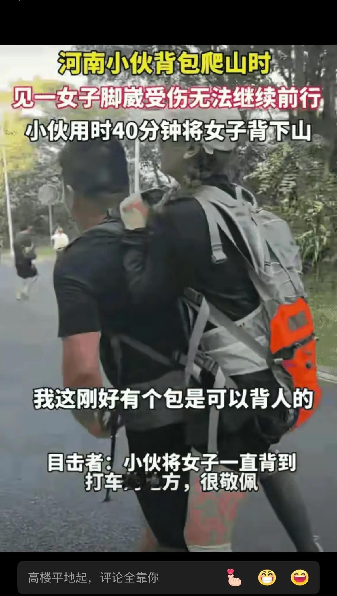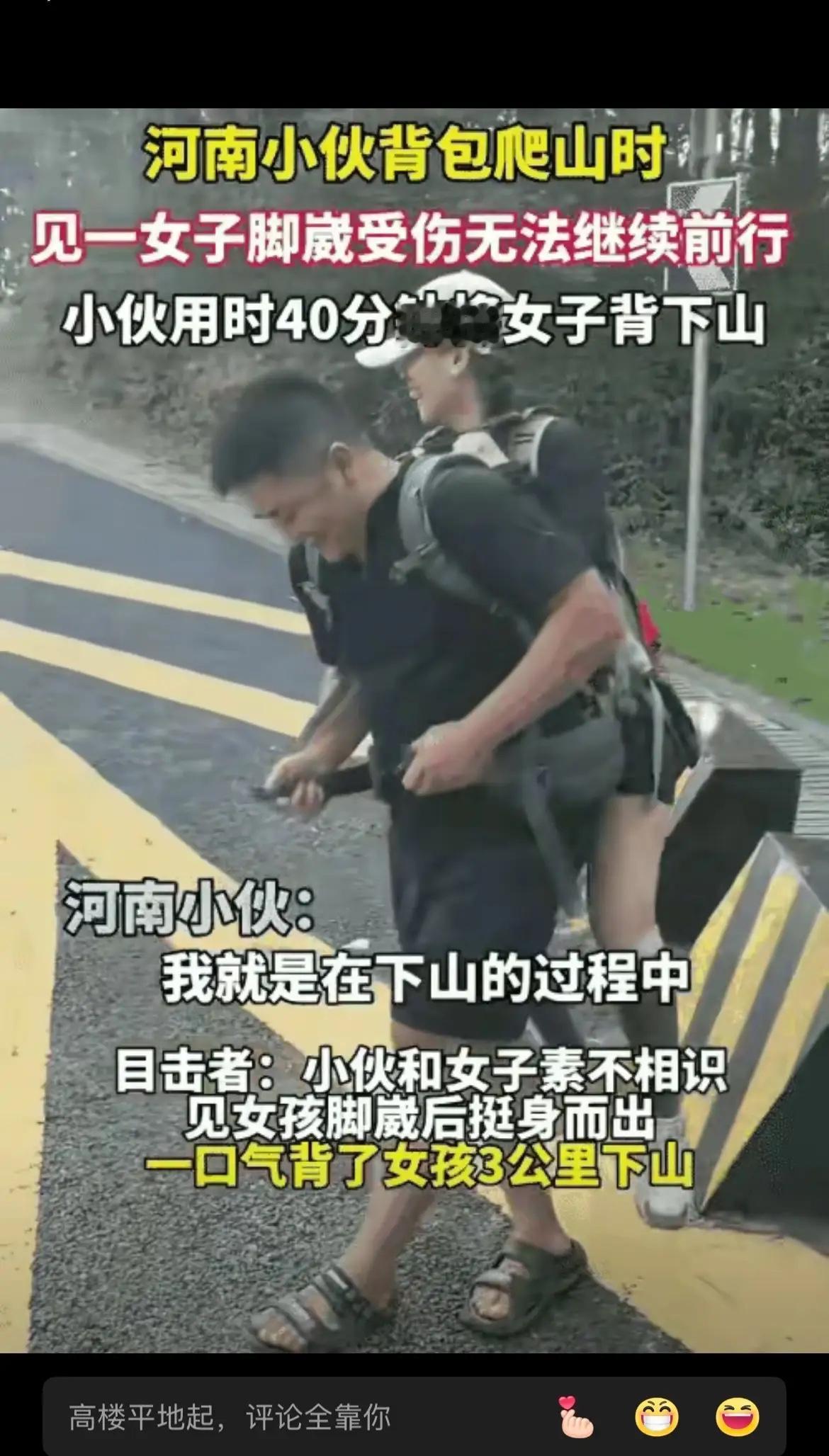 这位博主旅游路上看到感动人心的场面! 河南小伙爬山时看见一陌生女子脚崴受伤无法继续前行,小伙主动询问并施以援手,用时40分钟将女子背下山,小伙和女子素不相识,见女孩脚崴后挺身而出,一口气背了女孩3公里,直到打车的地方,这个河南小伙好样的,很令人敬佩,路过的人们看到这一幕……纷纷竖起大拇指,必须给小伙子点个赞,这是骨子里的善良。 爬山的路本就崎岖,碎石子混着松软的泥土,稍不留意就容易打滑。3公里的距离,平时空手走下来都得花上半个多小时,更别说背上一个成年人。小伙看着女子疼得直皱眉,额头上渗出的冷汗,没有丝毫犹豫就蹲下身:“上来吧,我背你下去。”没有多余的客套,语气朴实得像在帮邻居搭把手。 女子一开始还不好意思,反复说“不用不用,我再歇歇就能走”,可试着动了动脚踝,钻心的疼让她忍不住咧嘴。小伙看出了她的顾虑,笑着说:“没事儿,我年轻力气大,这点路不算啥。”说着就不由分说把她的胳膊架到自己肩上,稳稳站起身。 40分钟的路程,小伙的脚步越走越沉。博主在后面跟着拍,清楚看到他后背的衣服很快被汗水浸透,紧紧贴在身上,额角的汗珠顺着脸颊往下淌,滴在山间的小路上。他偶尔会停下来调整姿势,却从没放下过背上的女子,嘴里还时不时安慰:“快到了,再坚持一会儿,前面就有平坦的路了。” 女子趴在他背上,能清晰感受到他急促的呼吸和起伏的肩膀。她几次想下来自己挪几步,都被小伙拒绝:“脚崴了就得好好养,别再加重了,我能行。”途中遇到陡峭的下坡,小伙特意放慢脚步,一只手牢牢托住女子的腿,另一只手紧紧抓着旁边的灌木丛,每一步都走得格外小心。 路过的人们一开始只是好奇张望,看清情况后都忍不住放慢脚步。有大叔大声喊:“小伙子,要不要搭把手?”小伙笑着摆手致谢;有阿姨从包里掏出纸巾递过去:“擦擦汗,真是个好孩子。”还有小朋友拉着家长的手说:“妈妈,这个哥哥好棒啊!”大家你一言我一语的称赞,没有刻意的煽情,却满是真诚的认可。 到了山脚打车的地方,小伙把女子轻轻放下,自己则扶着膝盖大口喘气,脸上的汗水还在往下流,却依旧带着腼腆的笑容:“师傅来了,你赶紧上车去医院看看吧。”女子眼眶泛红,掏出钱想表示感谢,被小伙坚决拒绝:“不用不用,举手之劳而已。”直到看着女子坐上出租车离开,他才转身擦了擦汗,继续自己的爬山行程。 后来博主把这段视频发到网上,很快就引发了热议。有网友说:“河南人的善良从来都不是口号,是刻在骨子里的本能。”也有网友分享:“上次我在外地遇到困难,也是陌生的河南老乡帮了我,这份温暖太珍贵了。”更有人感慨:“现在很多人怕惹麻烦,遇到这种事都会犹豫,可这个小伙的毫不犹豫,让我们看到了人性最本真的美好。” 其实善良从来都不需要惊天动地,往往就藏在这些不起眼的瞬间里。一个素不相识的人,在别人需要帮助时,没有考虑过会不会被讹、会不会耽误自己的行程,只是凭着内心的善意挺身而出。这种不带功利心的帮助,才更让人动容。 河南作为中原大地,自古就有“崇德尚礼”的传统,这种淳朴的民风一代代传承下来,融入了每个河南人的血脉里。这个小伙的行为,不是个例,而是无数善良的中国人的缩影。在这个快节奏的社会里,我们或许会被生活的压力裹挟,会对陌生人保持警惕,但总有这样的瞬间,让我们相信,善良从未缺席。 这份善良,是困境中的援手,是寒冬里的暖阳,更是社会文明的底色。它不需要回报,却能传递无穷的力量,让更多人愿意伸出援手,让善意在人与人之间流动。当越来越多的人愿意为陌生人多一份善意,这个世界也会变得更加温暖。 各位读者你们怎么看?欢迎在评论区讨论。