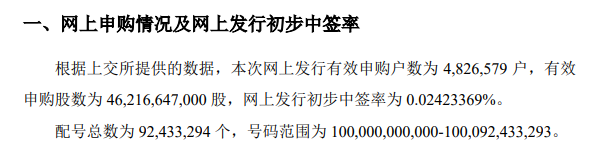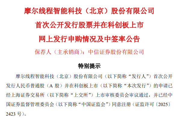 摩尔线程公告,根据上交所提供的数据,本次网上发行有效申购户数为482.66万户,有效申购股数为462.17亿股,网上发行初步中签率为0.02423369%。