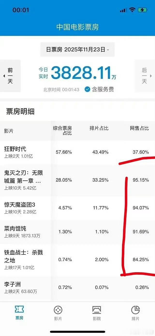 狂野时代网售占比才37%,退票率15%正常都90%以上,再低也不会低于80% 24号凌晨网售占比只有16.7% 大家怎么看呢