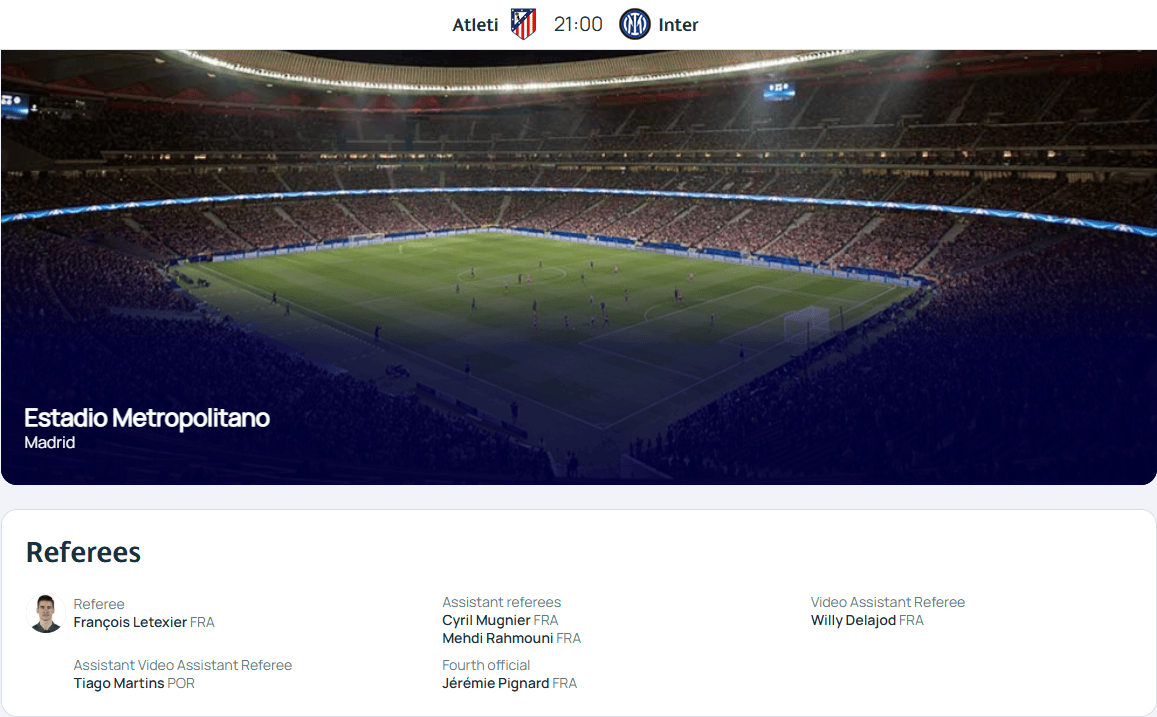 法国新生代名哨弗朗西斯-勒泰西耶将执法本场比赛。此前马竞在2023-24赛季欧冠小组赛3-2费耶诺德一役中曾遇上他执法,而国际米兰同样只在这个赛季的欧冠遇上过他来执法,小组赛2-1战胜萨尔茨堡红牛。