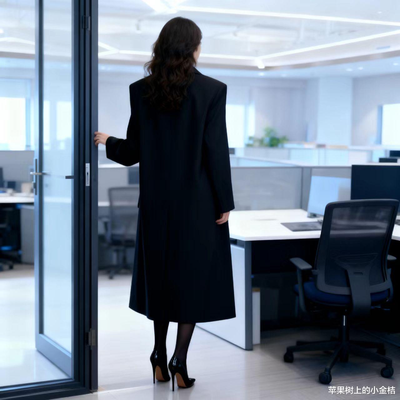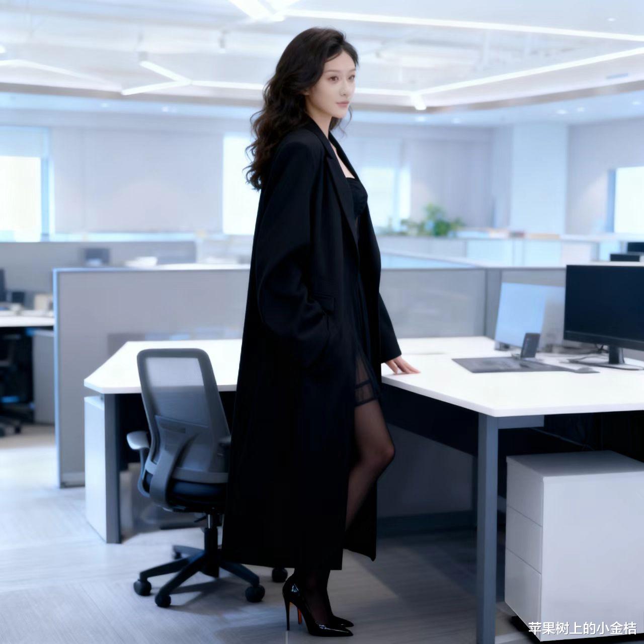 职场黑色大衣,内搭丝质连衣裙。既显性感又显端庄。